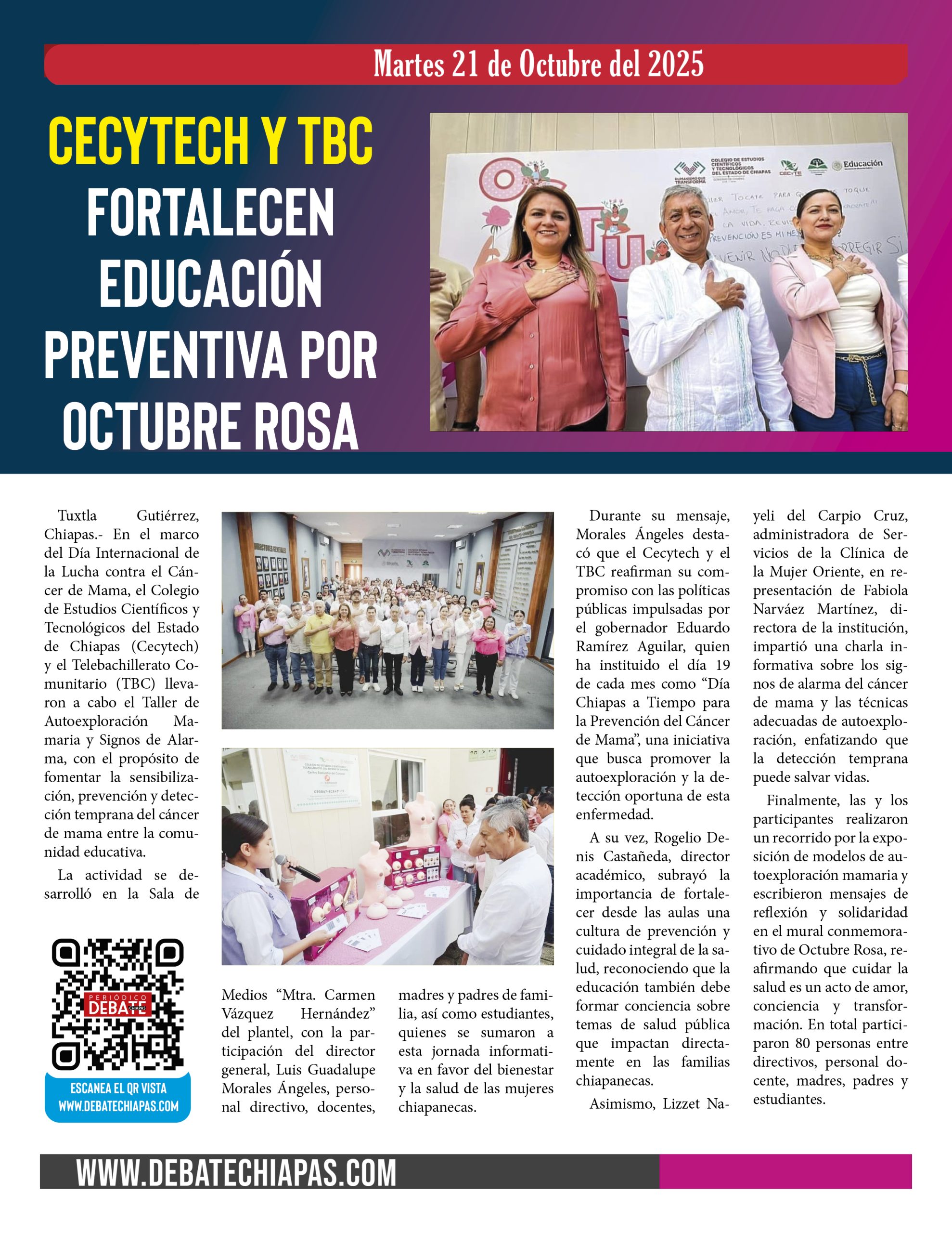 Durante su mensaje, Morales Ángeles destacó que el Cecytech y el TBC reafirman su compromiso con las políticas públicas impulsadas por el gobernador Eduardo Ramírez Aguilar, quien ha instituido el día 19 de cada mes como “Día Chiapas a Tiempo para la Prevención del Cáncer de Mama”, una iniciativa que busca promover la autoexploración y la detección oportuna de esta enfermedad.