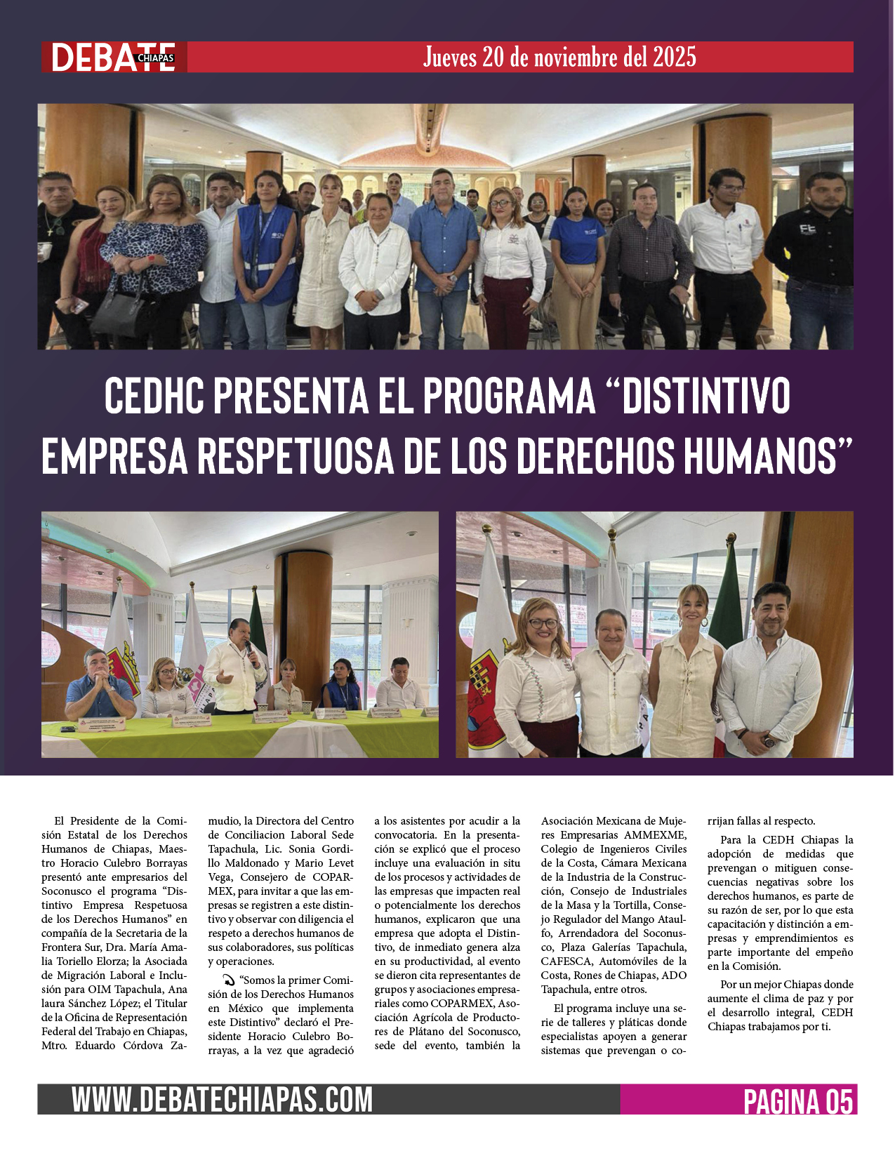 El Presidente de la Comisión Estatal de los Derechos Humanos de Chiapas, Maestro Horacio Culebro Borrayas presentó ante empresarios del Soconusco el programa “Distintivo Empresa Respetuosa de los Derechos Humanos” en compañía de la Secretaria de la Frontera Sur, Dra. María Amalia Toriello Elorza; la Asociada de Migración Laboral e Inclusión para OIM Tapachula, Ana laura Sánchez López; el Titular de la Oficina de Representación Federal del Trabajo en Chiapas, Mtro. Eduardo Córdova Zamudio, la Directora del Centro de Conciliacion Laboral Sede Tapachula, Lic. Sonia Gordillo Maldonado y Mario Levet Vega, Consejero de COPARMEX, para invitar a que las empresas se registren a este distintivo y observar con diligencia el respeto a derechos humanos de sus colaboradores, sus políticas y operaciones.