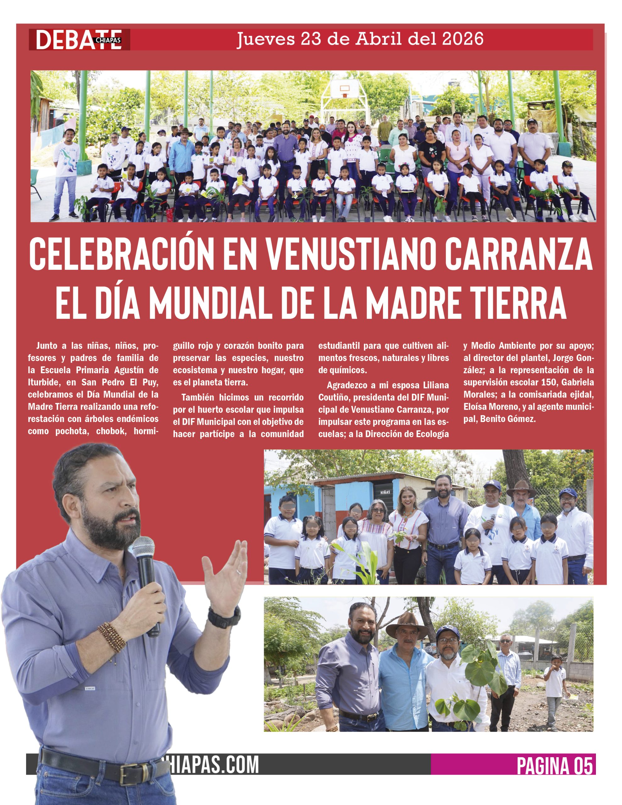 Agradezco a mi esposa Liliana Coutiño, presidenta del DIF Municipal de Venustiano Carranza, por impulsar este programa en las escuelas; a la Dirección de Ecología y Medio Ambiente por su apoyo; al director del plantel, Jorge González; a la representación de la supervisión escolar 150, Gabriela Morales; a la comisariada ejidal, Eloísa Moreno, y al agente municipal, Benito Gómez.