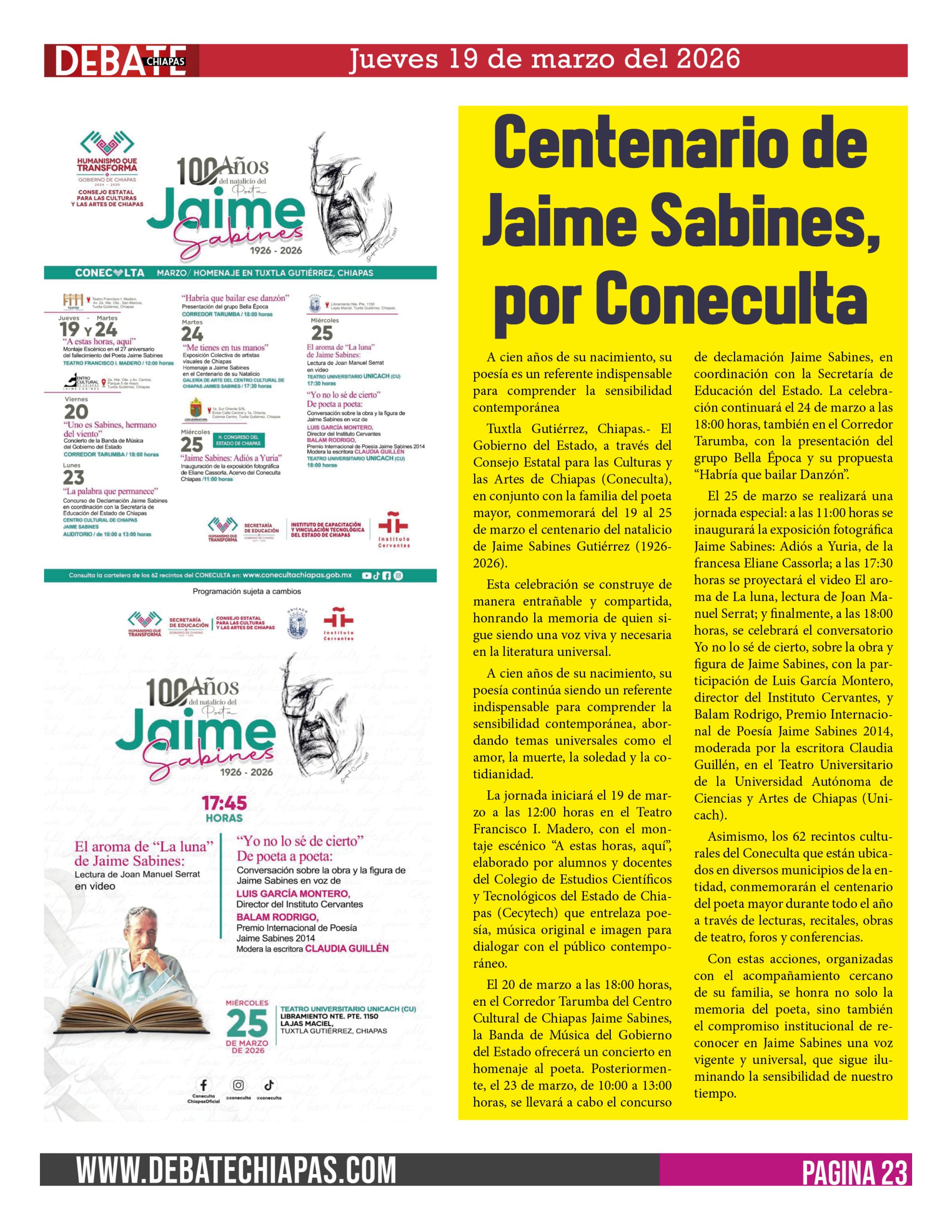 Tuxtla Gutiérrez, Chiapas.- El Gobierno del Estado, a través del Consejo Estatal para las Culturas y las Artes de Chiapas (Coneculta), en conjunto con la familia del poeta mayor, conmemorará del 19 al 25 de marzo el centenario del natalicio de Jaime Sabines Gutiérrez (1926-2026).