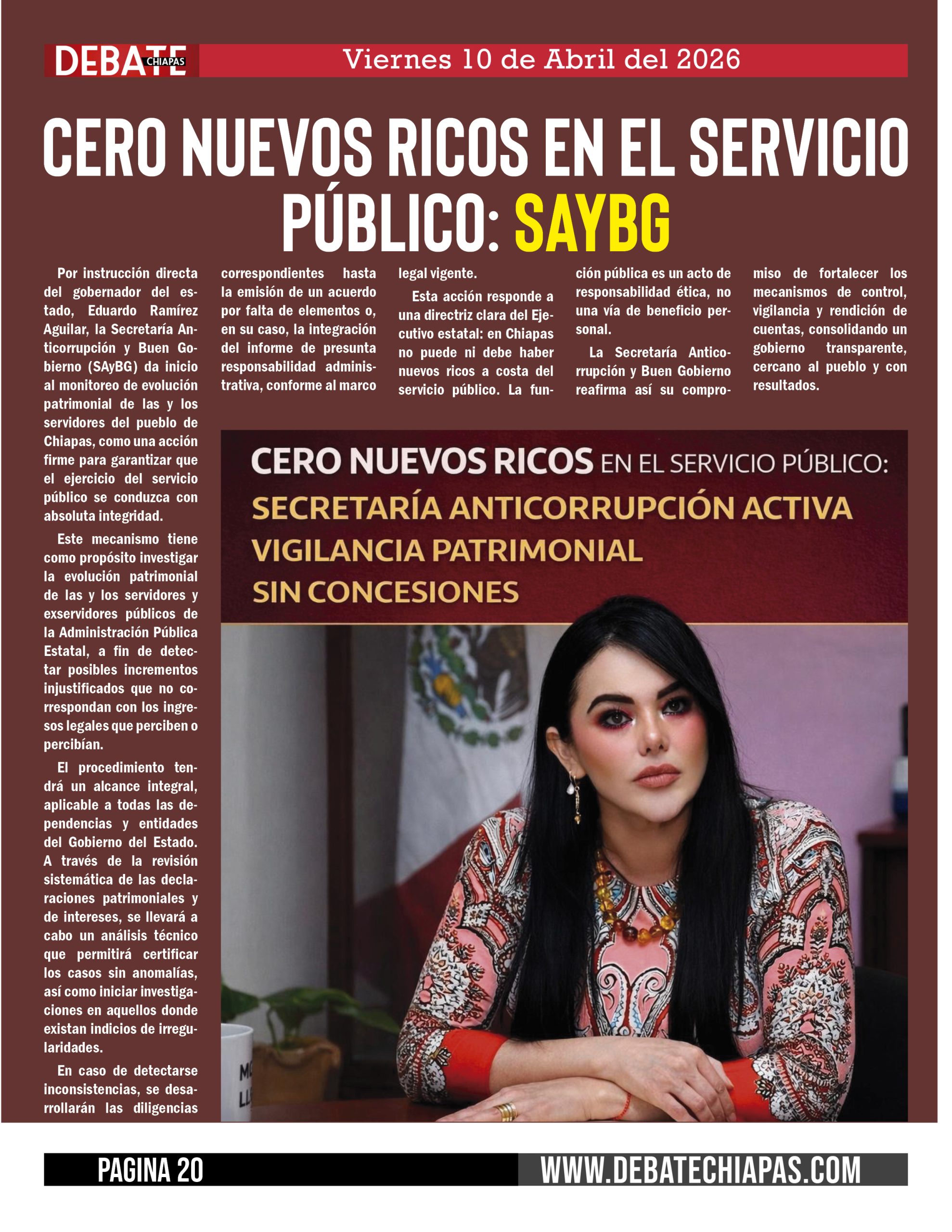 Esta acción responde a una directriz clara del Ejecutivo estatal: en Chiapas no puede ni debe haber nuevos ricos a costa del servicio público. La función pública es un acto de responsabilidad ética, no una vía de beneficio personal.