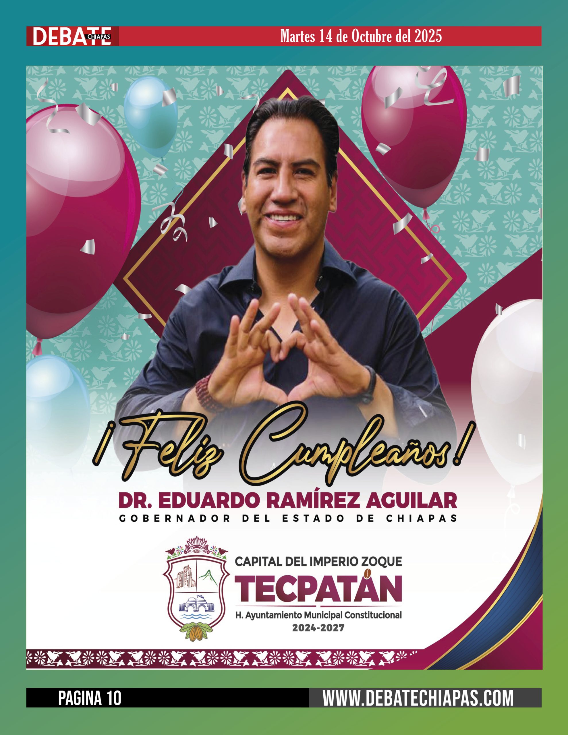 El H. Ayuntamiento Municipal de Tecpatán expresa una cordial felicitación al Dr. Eduardo Ramírez Aguilar, Gobernador Constitucional del Estado de Chiapas, con motivo de su cumpleaños.