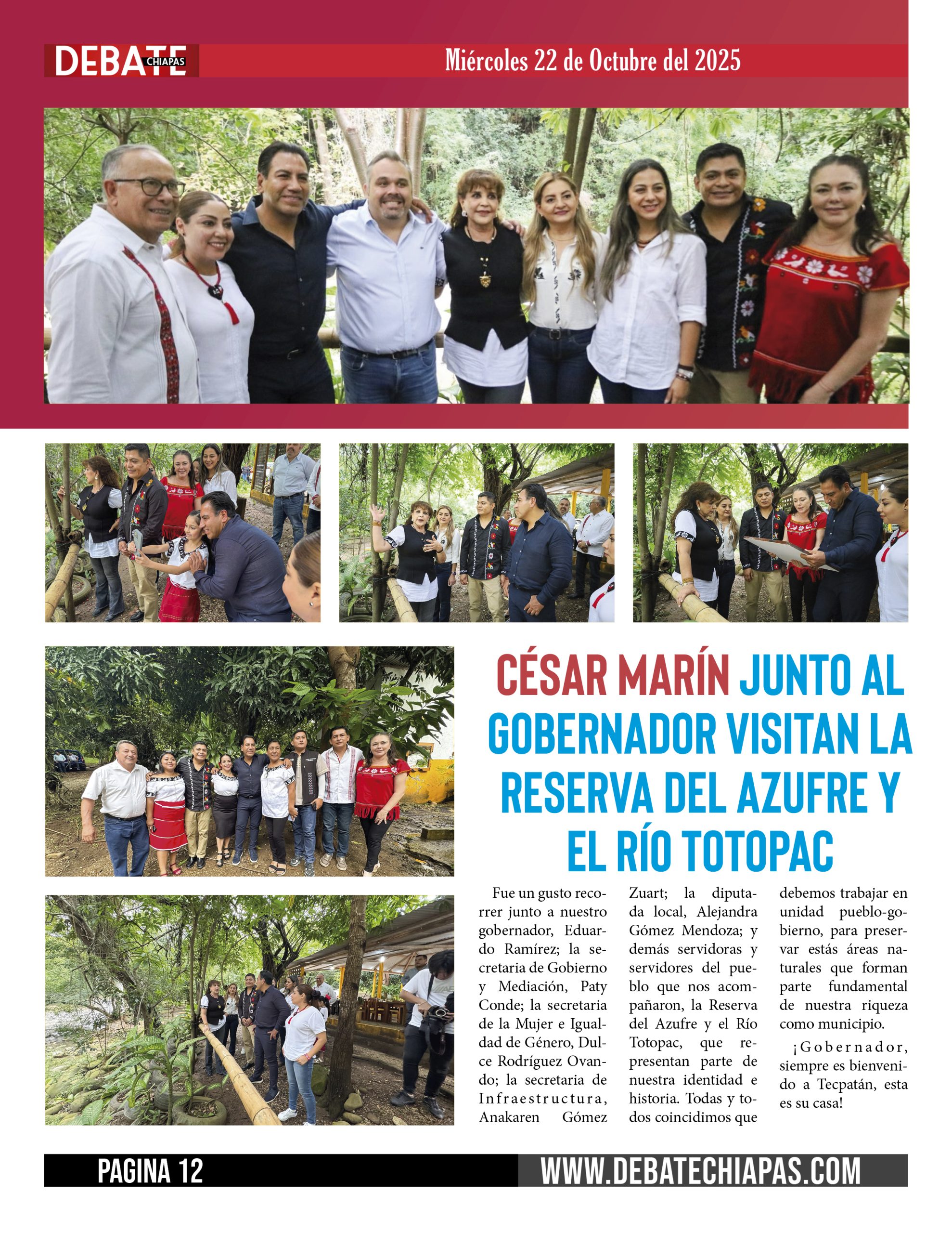 Fue un gusto recorrer junto a nuestro gobernador, Eduardo Ramírez; la secretaria de Gobierno y Mediación, Paty Conde; la secretaria de la Mujer e Igualdad de Género, Dulce Rodríguez Ovando; la secretaria de Infraestructura, Anakaren Gómez Zuart; la diputada local, Alejandra Gómez Mendoza; y demás servidoras y servidores del pueblo que nos acompañaron, la Reserva del Azufre y el Río Totopac, que representan parte de nuestra identidad e historia. Todas y todos coincidimos que debemos trabajar en unidad pueblo-gobierno, para preservar estás áreas naturales que forman parte fundamental de nuestra riqueza como municipio.