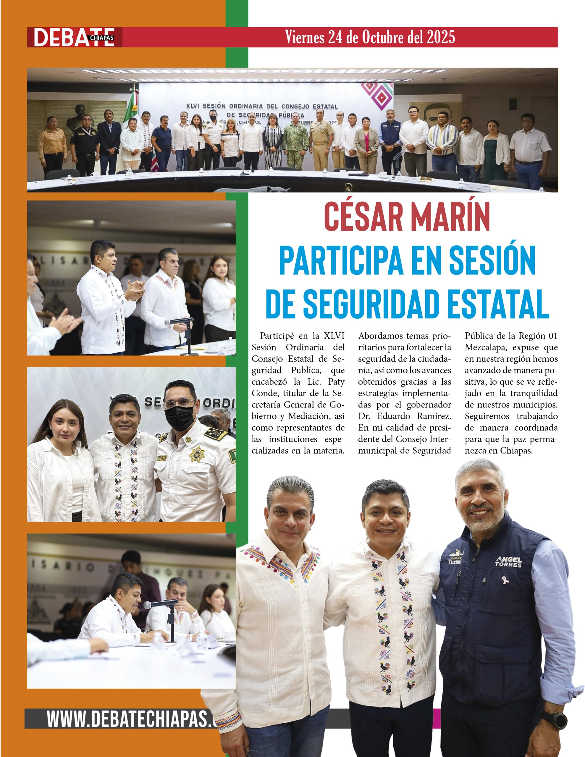 Participé en la XLVI Sesión Ordinaria del Consejo Estatal de Seguridad Publica, que encabezó la Lic. Paty Conde, titular de la Secretaría General de Gobierno y Mediación, así como representantes de las instituciones especializadas en la materia. Abordamos temas prioritarios para fortalecer la seguridad de la ciudadanía, así como los avances obtenidos gracias a las estrategias implementadas por el gobernador Dr. Eduardo Ramírez. En mi calidad de presidente del Consejo Intermunicipal de Seguridad Pública de la Región 01 Mezcalapa, expuse que en nuestra región hemos avanzado de manera positiva, lo que se ve reflejado en la tranquilidad de nuestros municipios. Seguiremos trabajando de manera coordinada para que la paz permanezca en Chiapas.