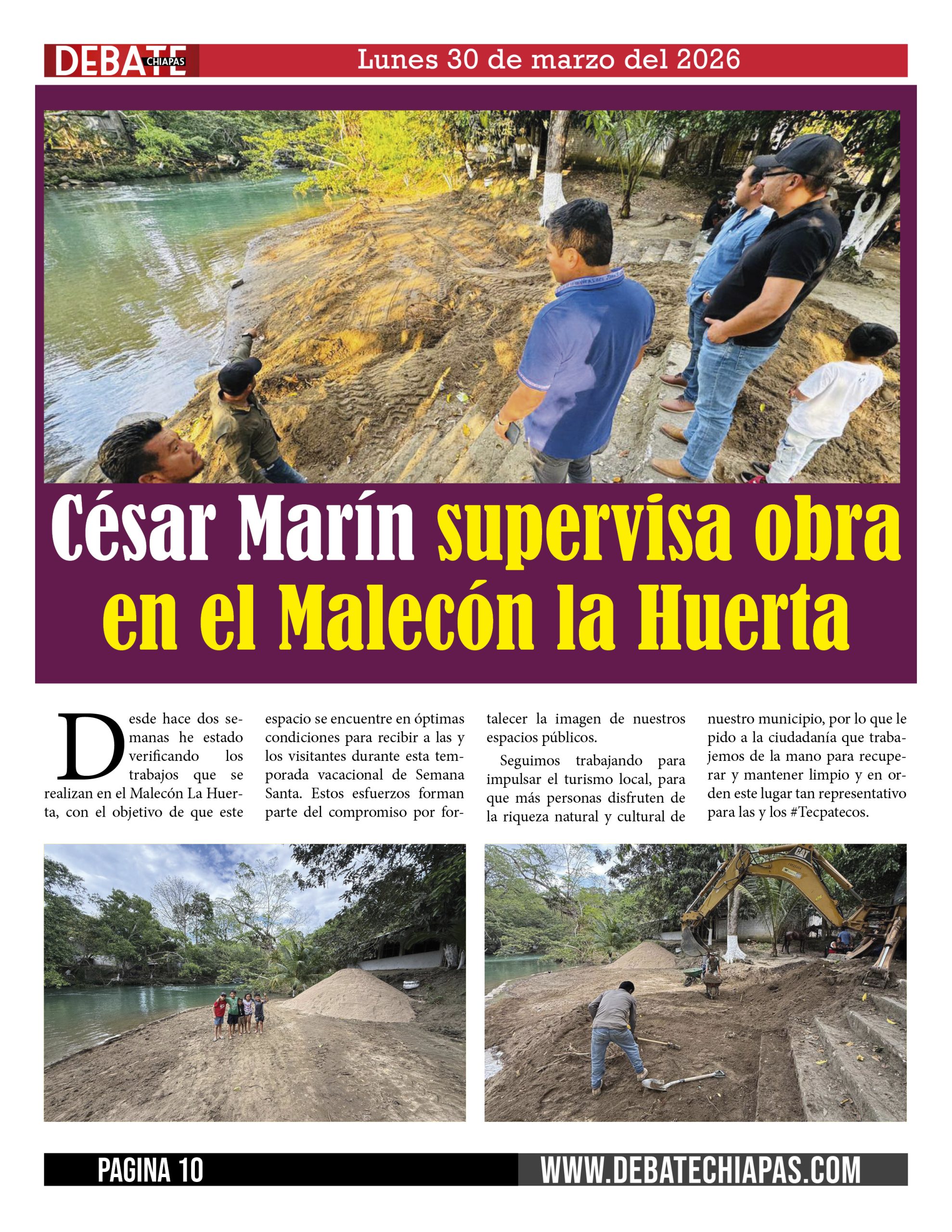 Desde hace dos semanas he estado verificando los trabajos que se realizan en el Malecón La Huerta, con el objetivo de que este espacio se encuentre en óptimas condiciones para recibir a las y los visitantes durante esta temporada vacacional de Semana Santa. Estos esfuerzos forman parte del compromiso por fortalecer la imagen de nuestros espacios públicos.