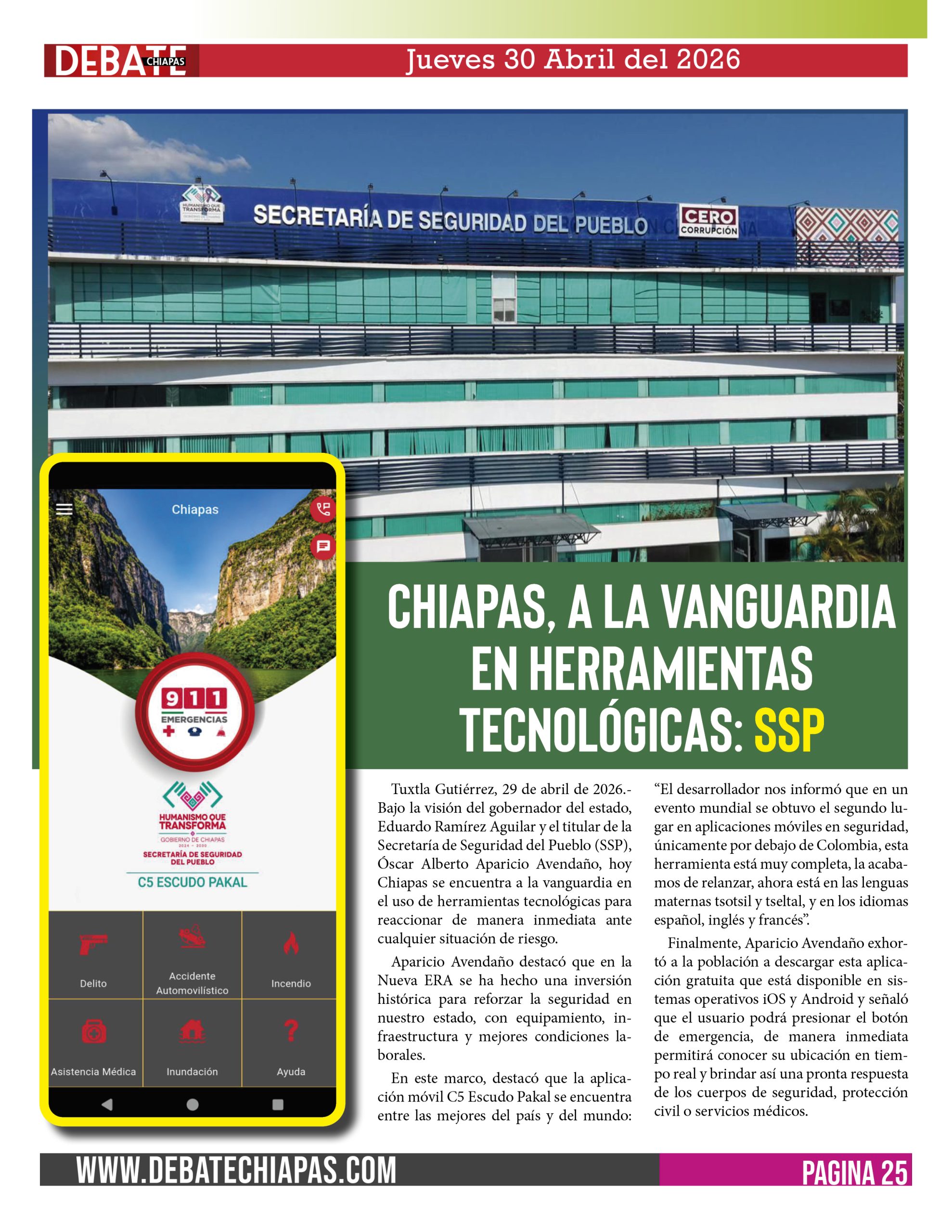 Tuxtla Gutiérrez, 29 de abril de 2026.- Bajo la visión del gobernador del estado, Eduardo Ramírez Aguilar y el titular de la Secretaría de Seguridad del Pueblo (SSP), Óscar Alberto Aparicio Avendaño, hoy Chiapas se encuentra a la vanguardia en el uso de herramientas tecnológicas para reaccionar de manera inmediata ante cualquier situación de riesgo.