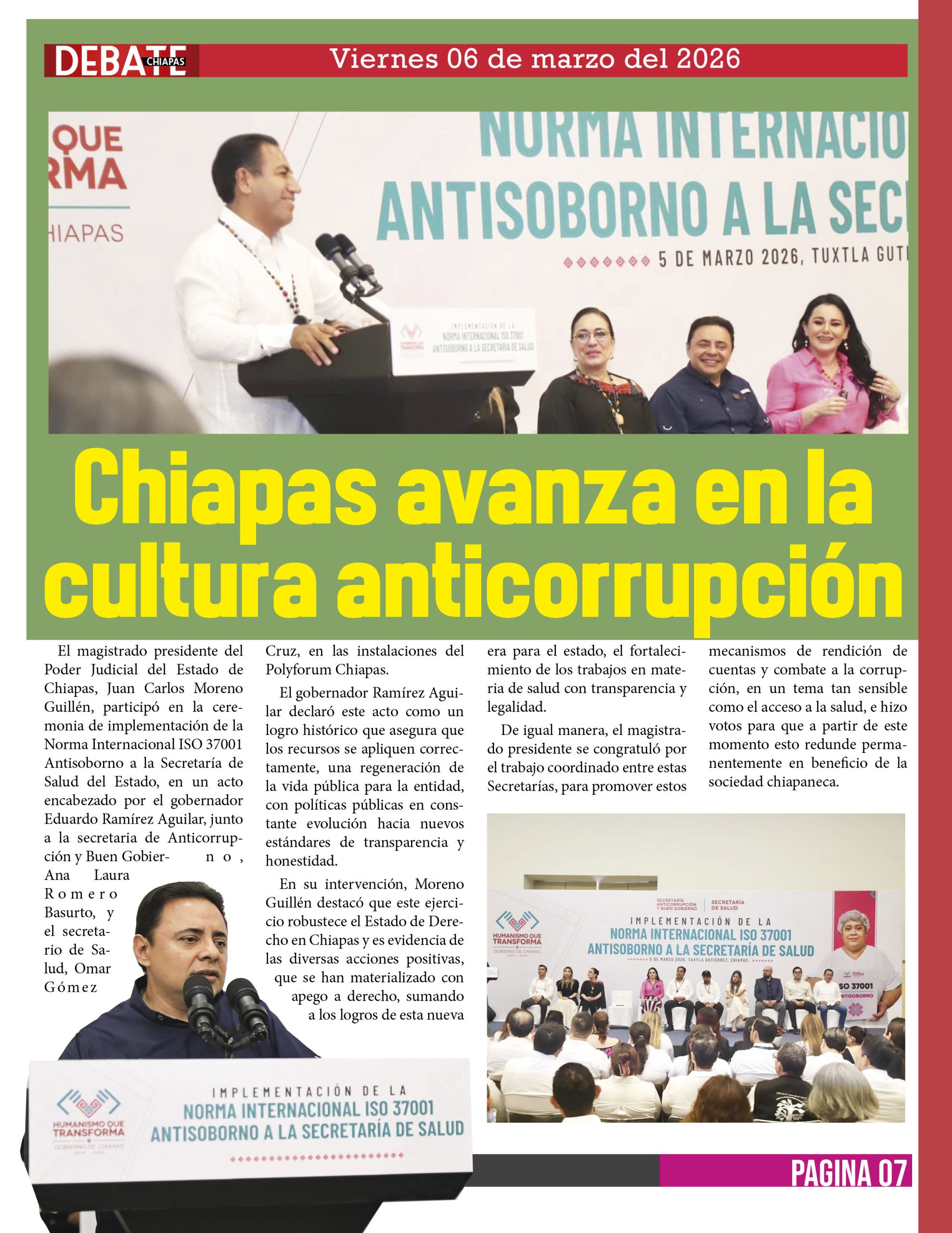 El magistrado presidente del Poder Judicial del Estado de Chiapas, Juan Carlos Moreno Guillén, participó en la ceremonia de implementación de la Norma Internacional ISO 37001 Antisoborno a la Secretaría de Salud del Estado, en un acto encabezado por el gobernador Eduardo Ramírez Aguilar, junto a la secretaria de Anticorrupción y Buen Gobierno, Ana Laura Romero Basurto, y el secretario de Salud, Omar Gómez Cruz, en las instalaciones del Polyforum Chiapas.