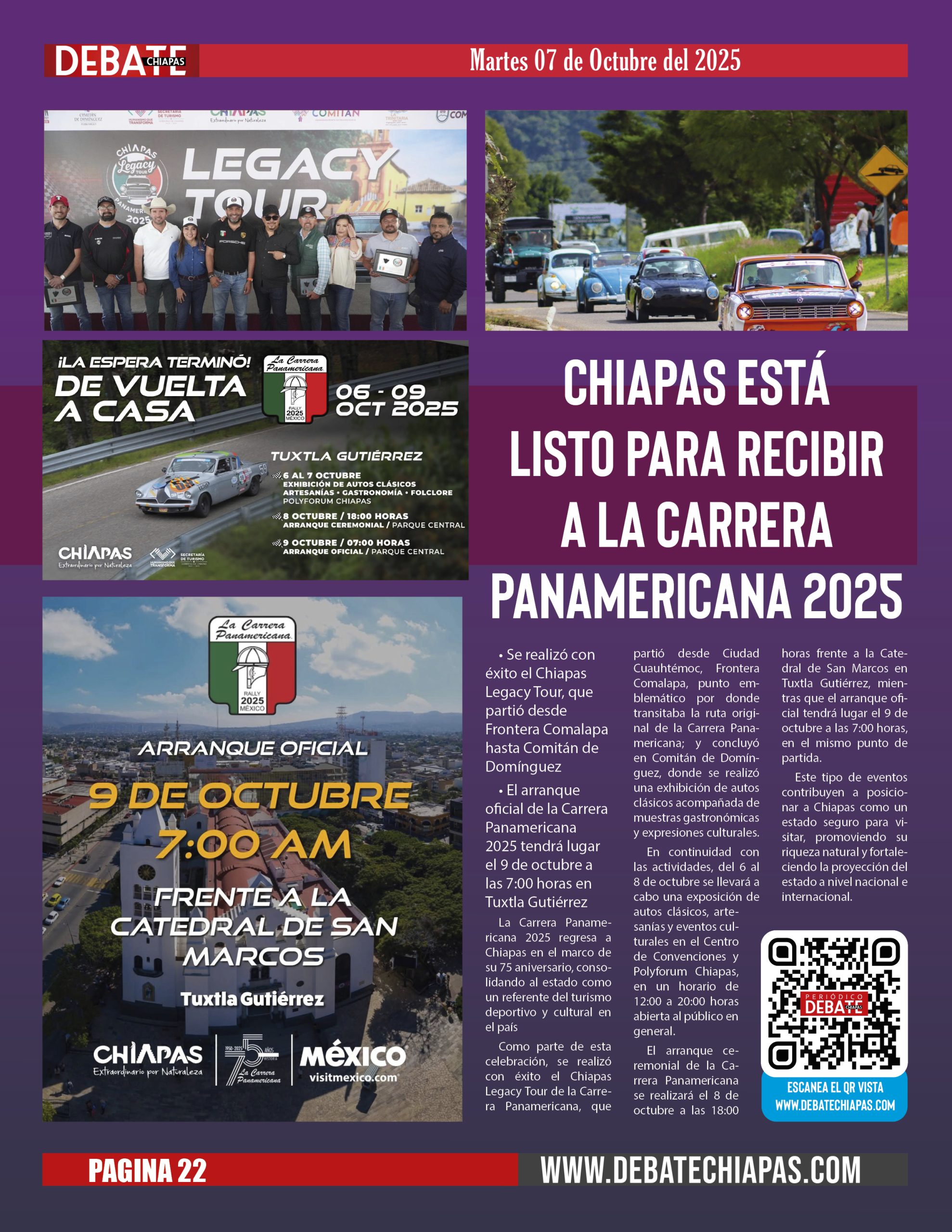 El arranque ceremonial de la Carrera Panamericana se realizará el 8 de octubre a las 18:00 horas frente a la Catedral de San Marcos en Tuxtla Gutiérrez, mientras que el arranque oficial tendrá lugar el 9 de octubre a las 7:00 horas, en el mismo punto de partida.