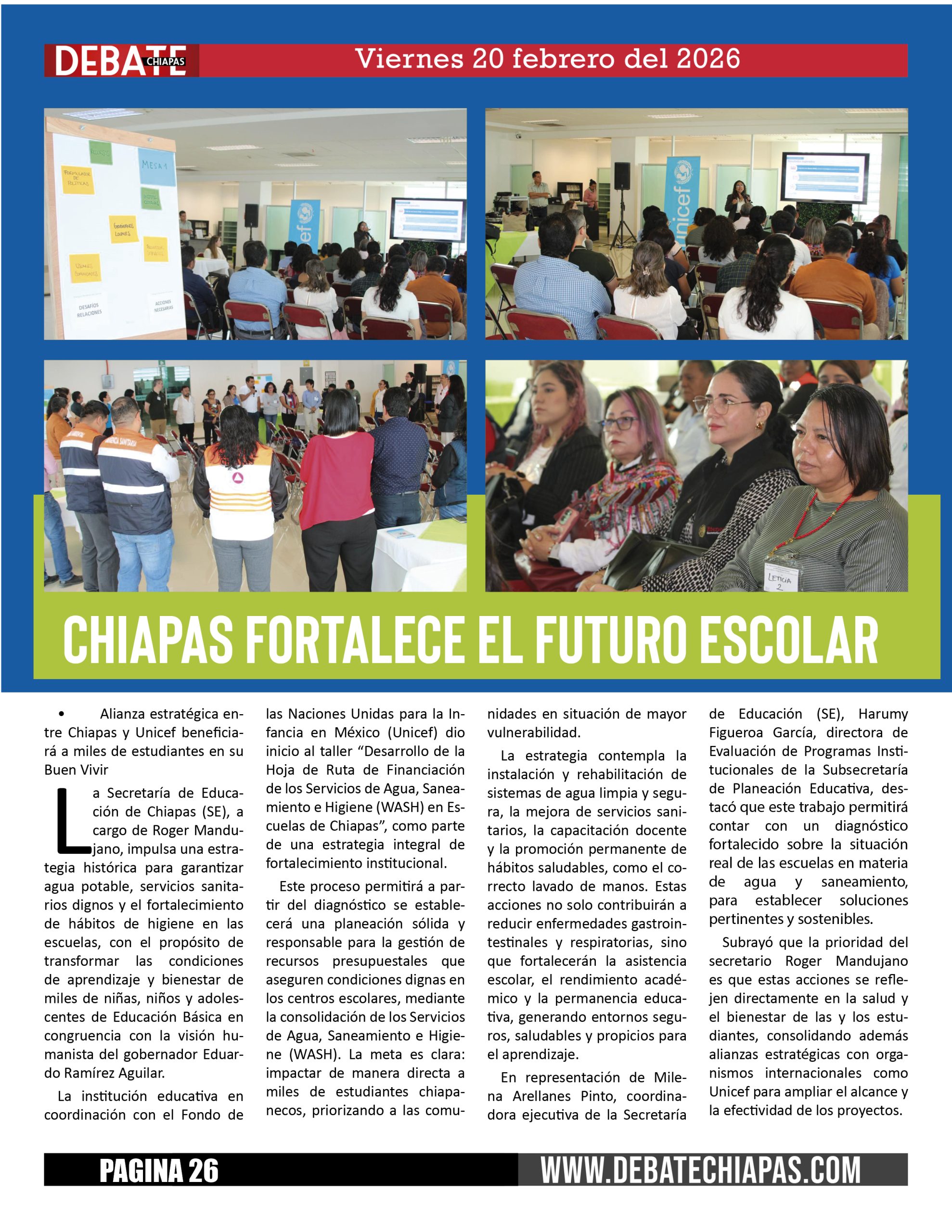 La Secretaría de Educación de Chiapas (SE), a cargo de Roger Mandujano, impulsa una estrategia histórica para garantizar agua potable, servicios sanitarios dignos y el fortalecimiento de hábitos de higiene en las escuelas, con el propósito de transformar las condiciones de aprendizaje y bienestar de miles de niñas, niños y adolescentes de Educación Básica en congruencia con la visión humanista del gobernador Eduardo Ramírez Aguilar.