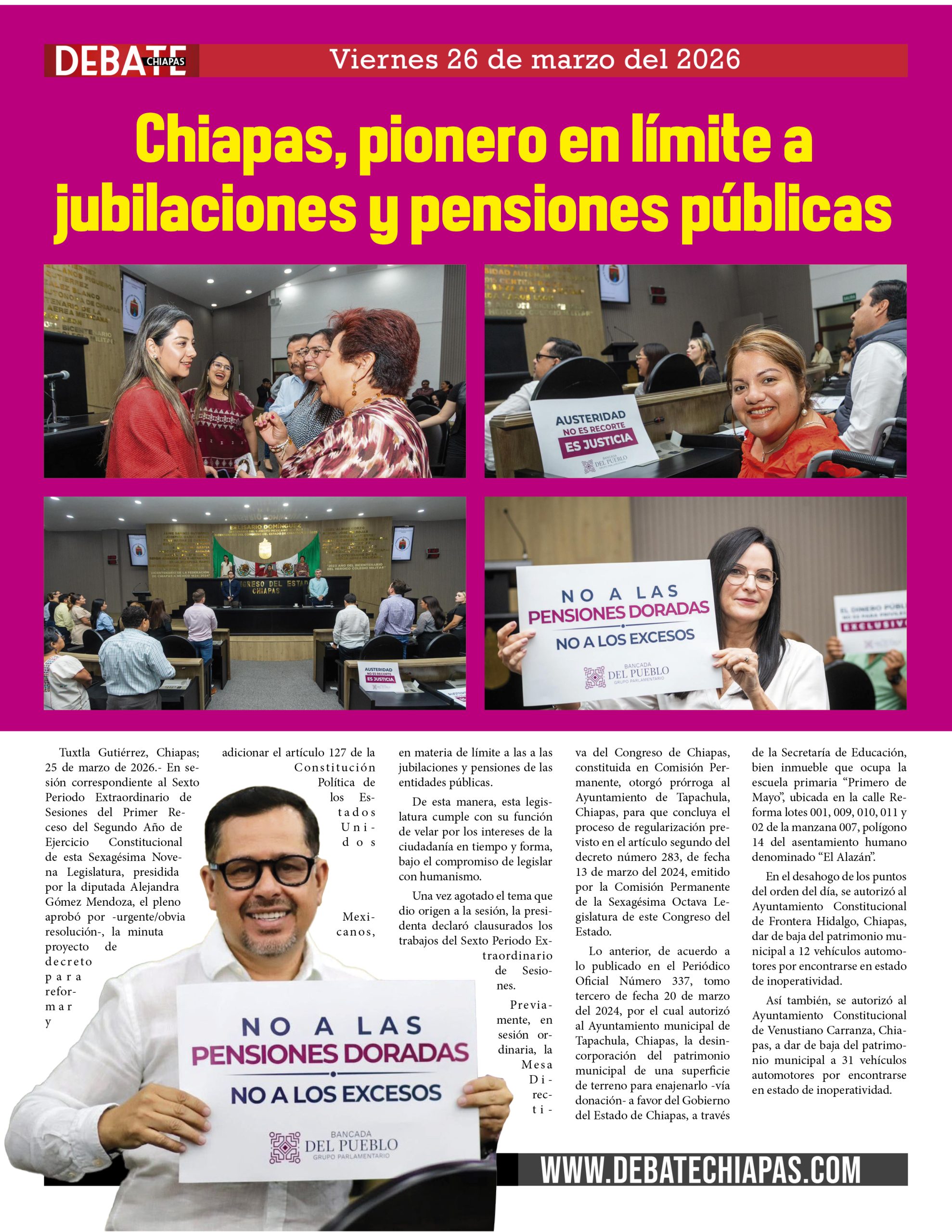 Tuxtla Gutiérrez, Chiapas; 25 de marzo de 2026.- En sesión correspondiente al Sexto Periodo Extraordinario de Sesiones del Primer Receso del Segundo Año de Ejercicio Constitucional de esta Sexagésima Novena Legislatura, presidida por la diputada Alejandra Gómez Mendoza, el pleno aprobó por -urgente/obvia resolución-, la minuta proyecto de decreto para reformar y adicionar el artículo 127 de la Constitución Política de los Estados Unidos Mexicanos, en materia de límite a las a las jubilaciones y pensiones de las entidades públicas.
