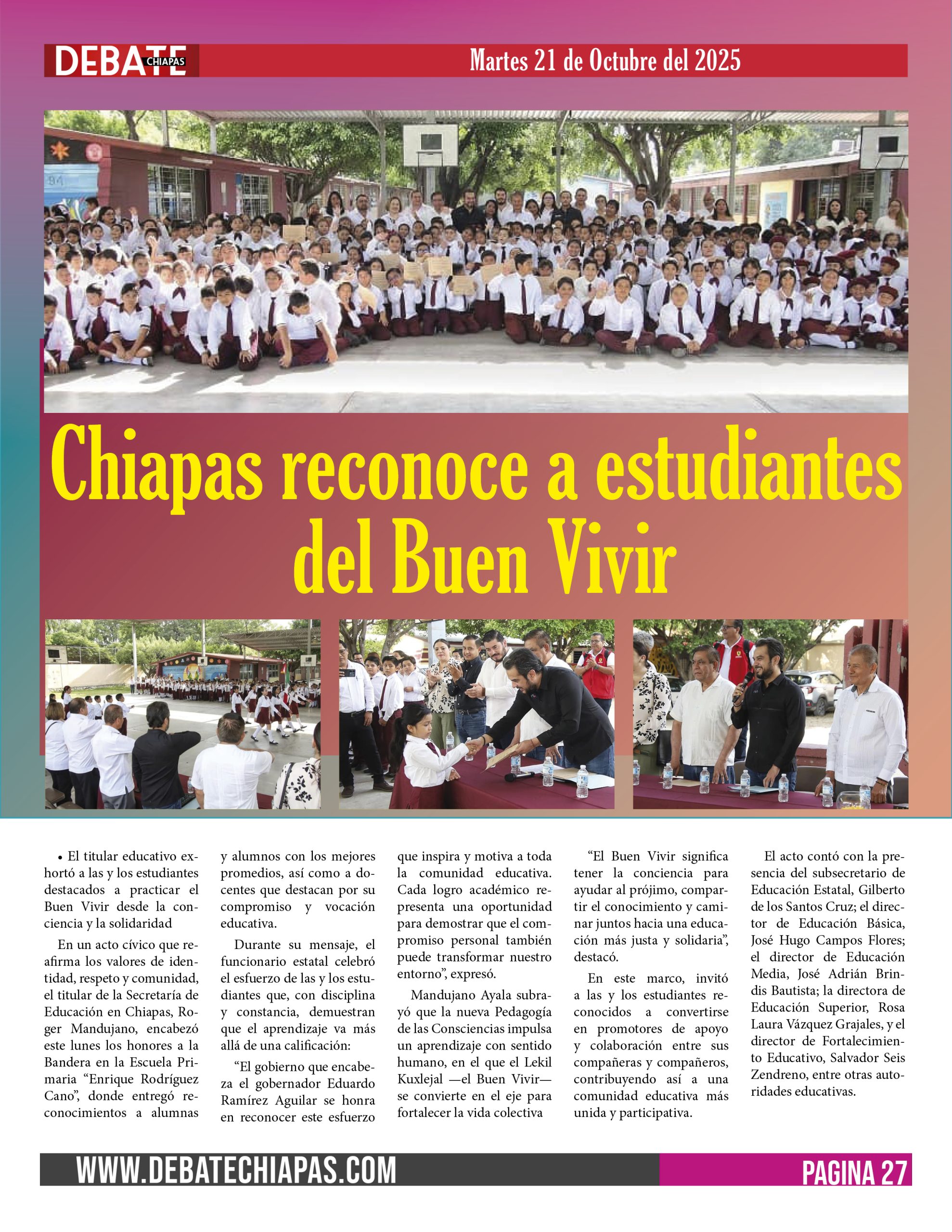 En un acto cívico que reafirma los valores de identidad, respeto y comunidad, el titular de la Secretaría de Educación en Chiapas, Roger Mandujano, encabezó este lunes los honores a la Bandera en la Escuela Primaria “Enrique Rodríguez Cano”, donde entregó reconocimientos a alumnas y alumnos con los mejores promedios, así como a docentes que destacan por su compromiso y vocación educativa.