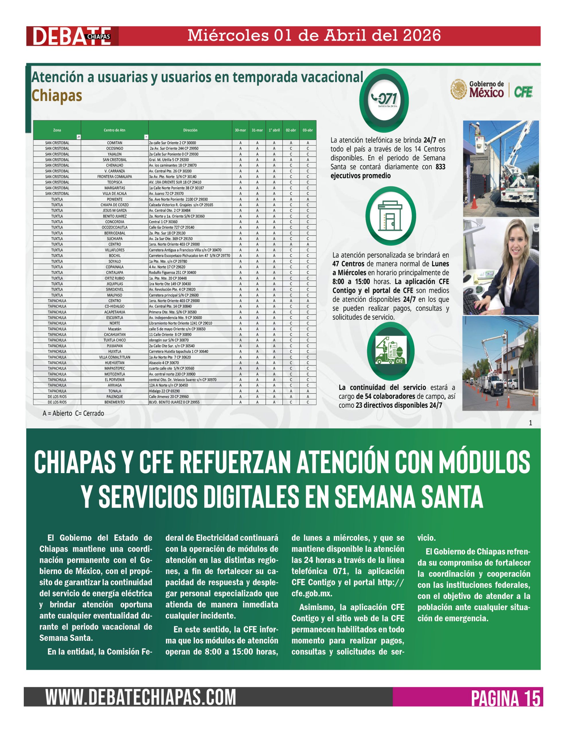 Chiapas y CFE refuerzan atención con módulos y servicios digitales en Semana Santa