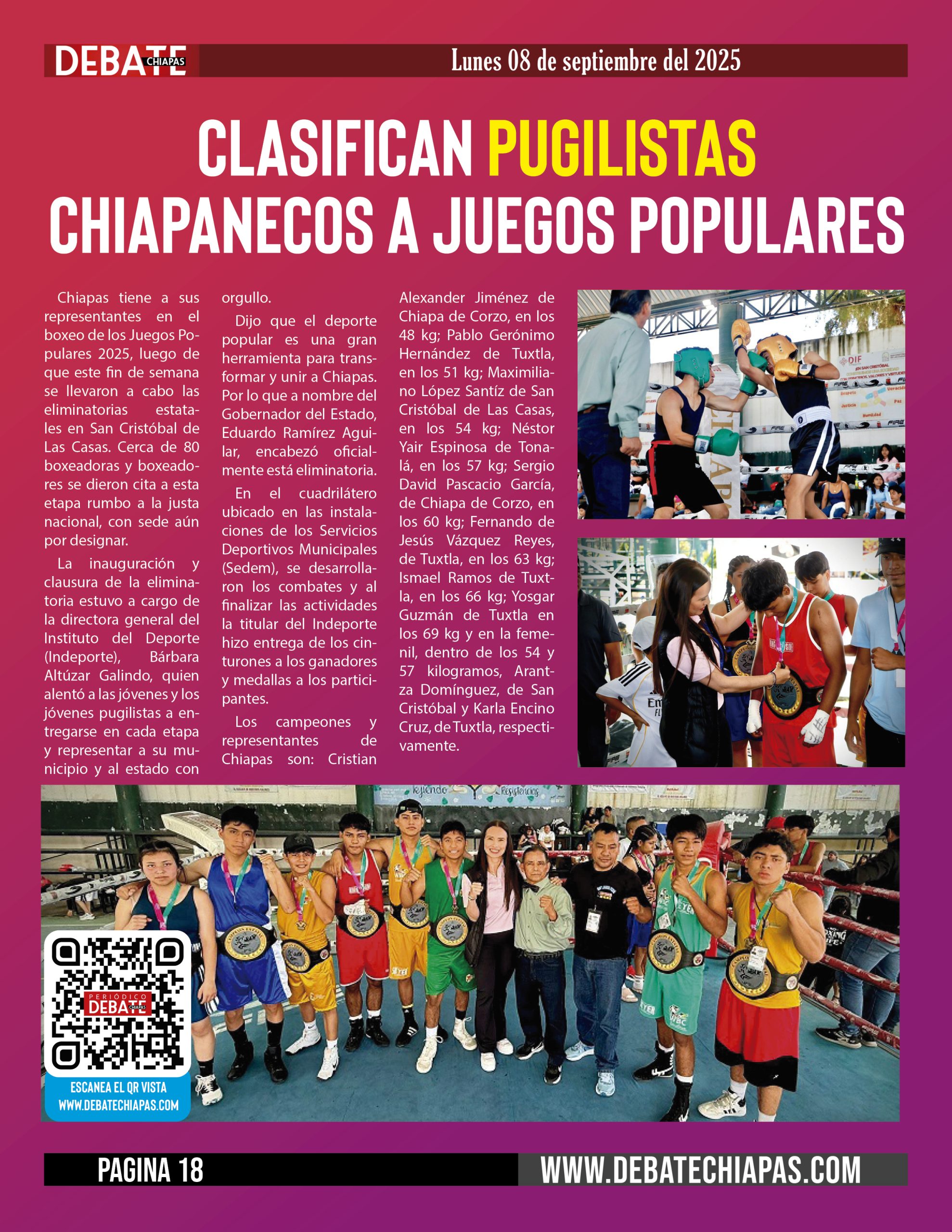 Chiapas tiene a sus representantes en el boxeo de los Juegos Populares 2025, luego de que este fin de semana se llevaron a cabo las eliminatorias estatales en San Cristóbal de Las Casas. Cerca de 80 boxeadoras y boxeadores se dieron cita a esta etapa rumbo a la justa nacional, con sede aún por designar.