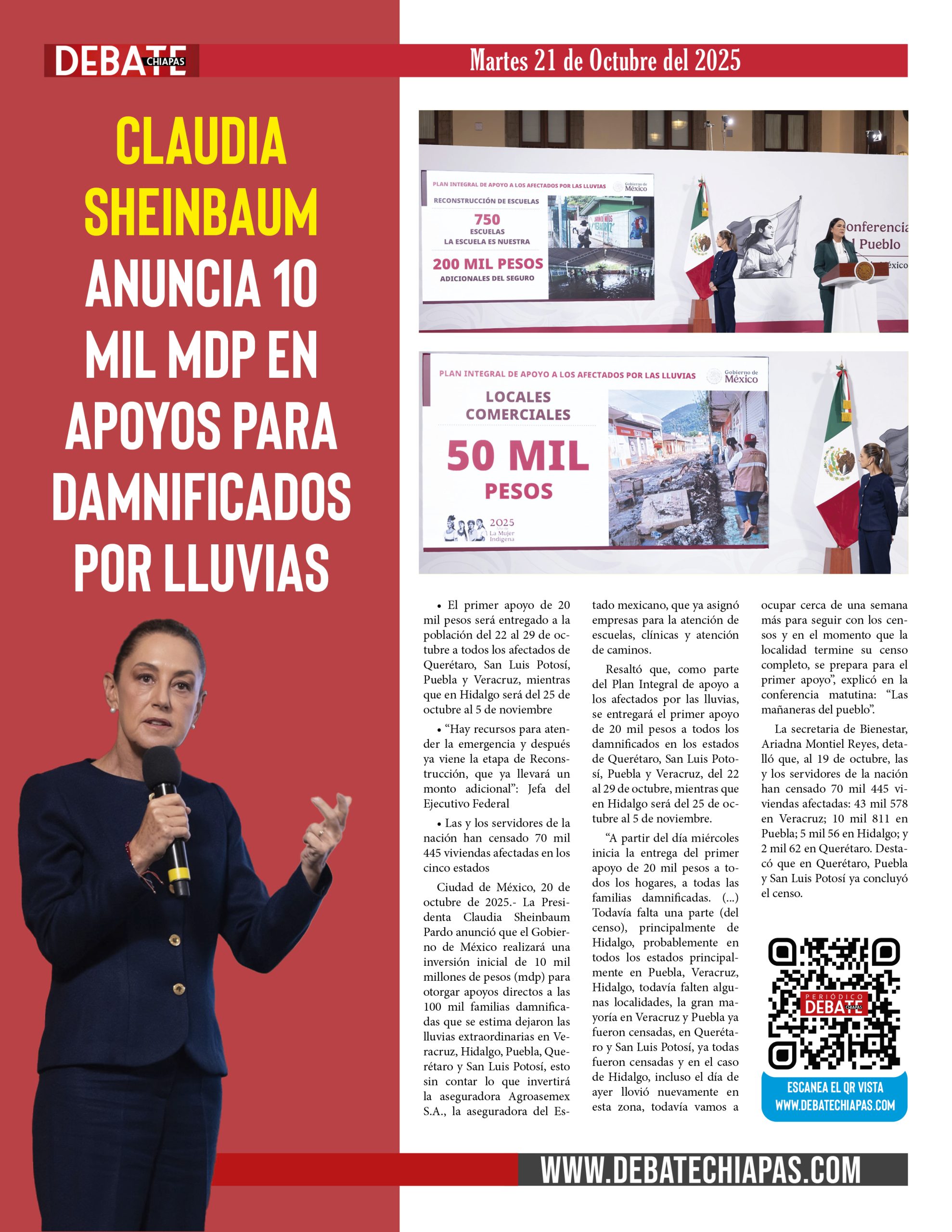Ciudad de México, 20 de octubre de 2025.- La Presidenta Claudia Sheinbaum Pardo anunció que el Gobierno de México realizará una inversión inicial de 10 mil millones de pesos (mdp) para otorgar apoyos directos a las 100 mil familias damnificadas que se estima dejaron las lluvias extraordinarias en Veracruz, Hidalgo, Puebla, Querétaro y San Luis Potosí, esto sin contar lo que invertirá la aseguradora Agroasemex S.A., la aseguradora del Estado mexicano, que ya asignó empresas para la atención de escuelas, clínicas y atención de caminos.
