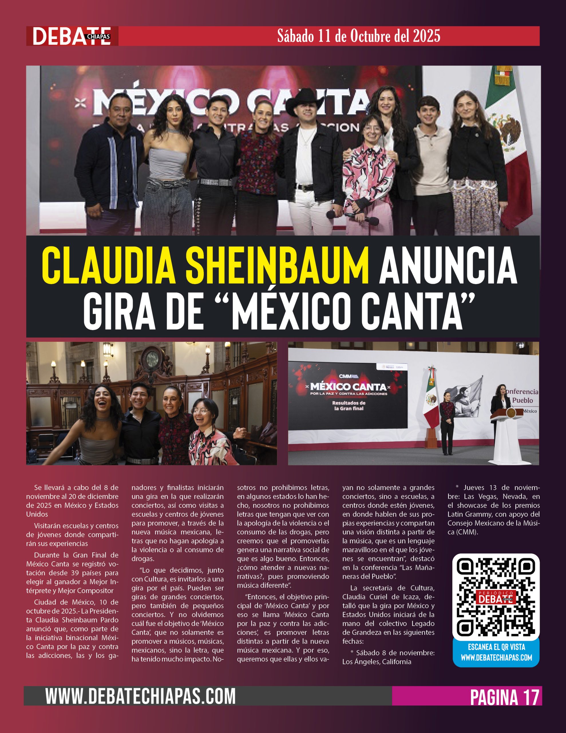 Ciudad de México, 10 de octubre de 2025.- La Presidenta Claudia Sheinbaum Pardo anunció que, como parte de la iniciativa binacional México Canta por la paz y contra las adicciones, las y los ganadores y finalistas iniciarán una gira en la que realizarán conciertos, así como visitas a escuelas y centros de jóvenes para promover, a través de la nueva música mexicana, letras que no hagan apología a la violencia o al consumo de drogas.