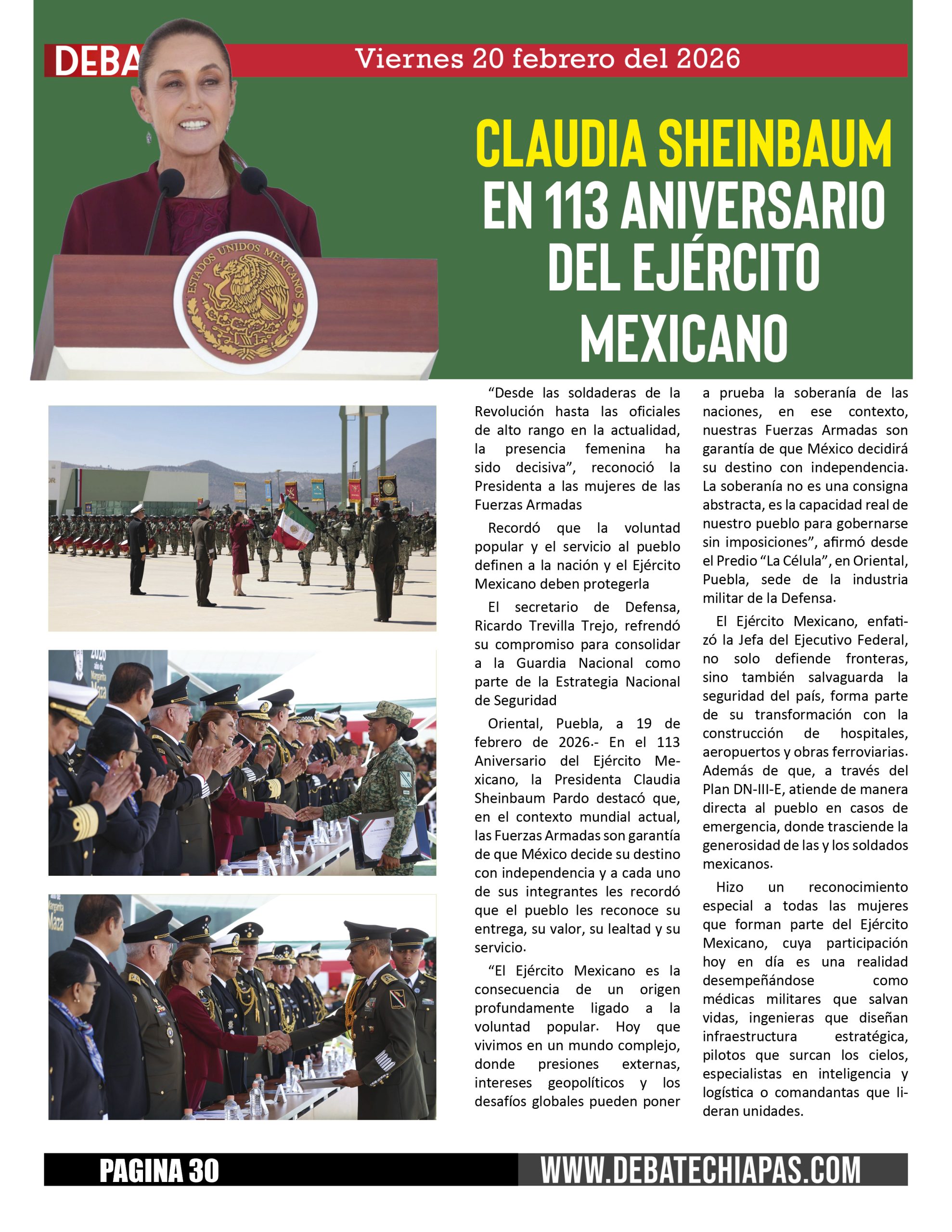 Oriental, Puebla, a 19 de febrero de 2026.- En el 113 Aniversario del Ejército Mexicano, la Presidenta Claudia Sheinbaum Pardo destacó que, en el contexto mundial actual, las Fuerzas Armadas son garantía de que México decide su destino con independencia y a cada uno de sus integrantes les recordó que el pueblo les reconoce su entrega, su valor, su lealtad y su servicio.