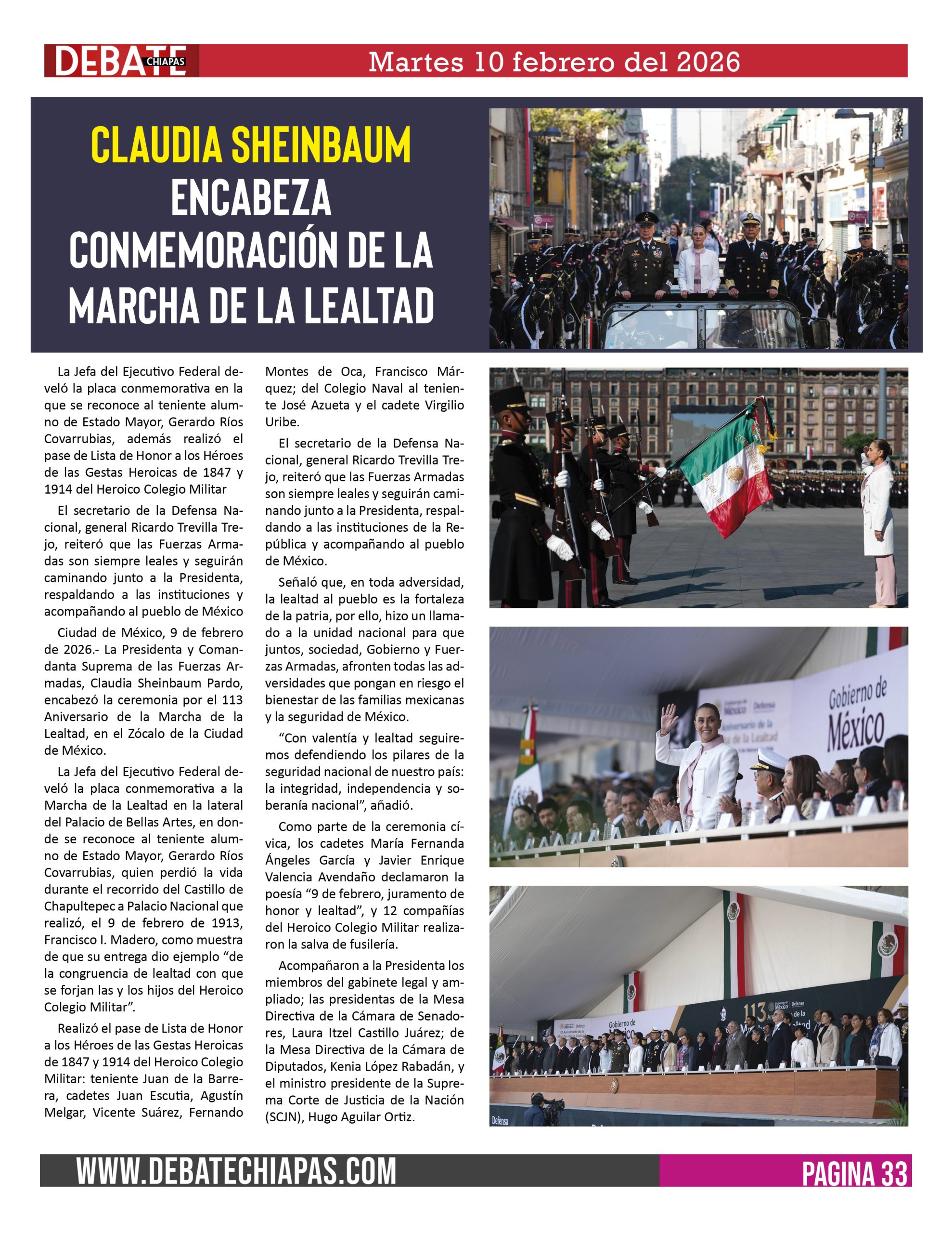 La Jefa del Ejecutivo Federal develó la placa conmemorativa a la Marcha de la Lealtad en la lateral del Palacio de Bellas Artes, en donde se reconoce al teniente alumno de Estado Mayor, Gerardo Ríos Covarrubias, quien perdió la vida durante el recorrido del Castillo de Chapultepec a Palacio Nacional que realizó, el 9 de febrero de 1913, Francisco I. Madero, como muestra de que su entrega dio ejemplo “de la congruencia de lealtad con que se forjan las y los hijos del Heroico Colegio Militar”.