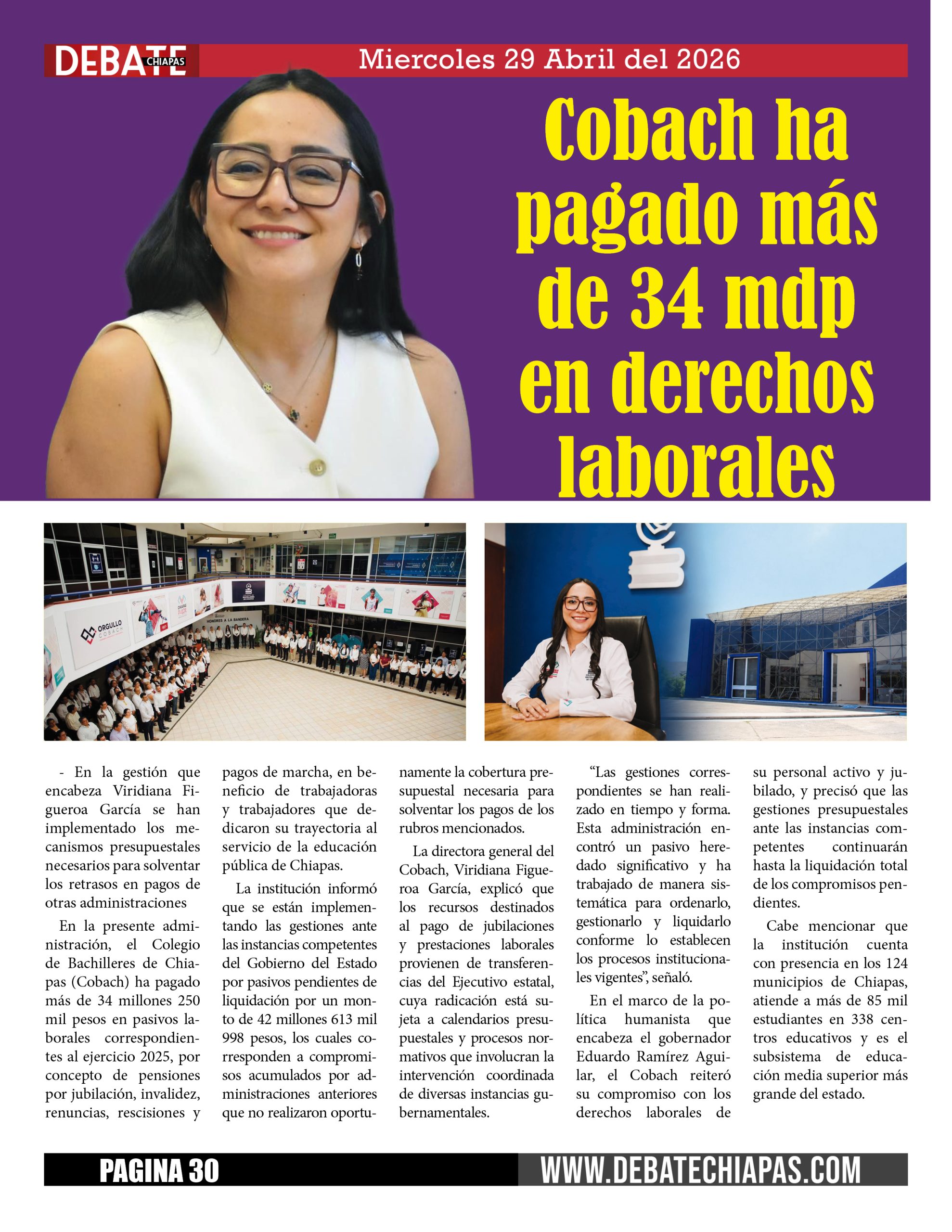 En la presente administración, el Colegio de Bachilleres de Chiapas (Cobach) ha pagado más de 34 millones 250 mil pesos en pasivos laborales correspondientes al ejercicio 2025, por concepto de pensiones por jubilación, invalidez, renuncias, rescisiones y pagos de marcha, en beneficio de trabajadoras y trabajadores que dedicaron su trayectoria al servicio de la educación pública de Chiapas.