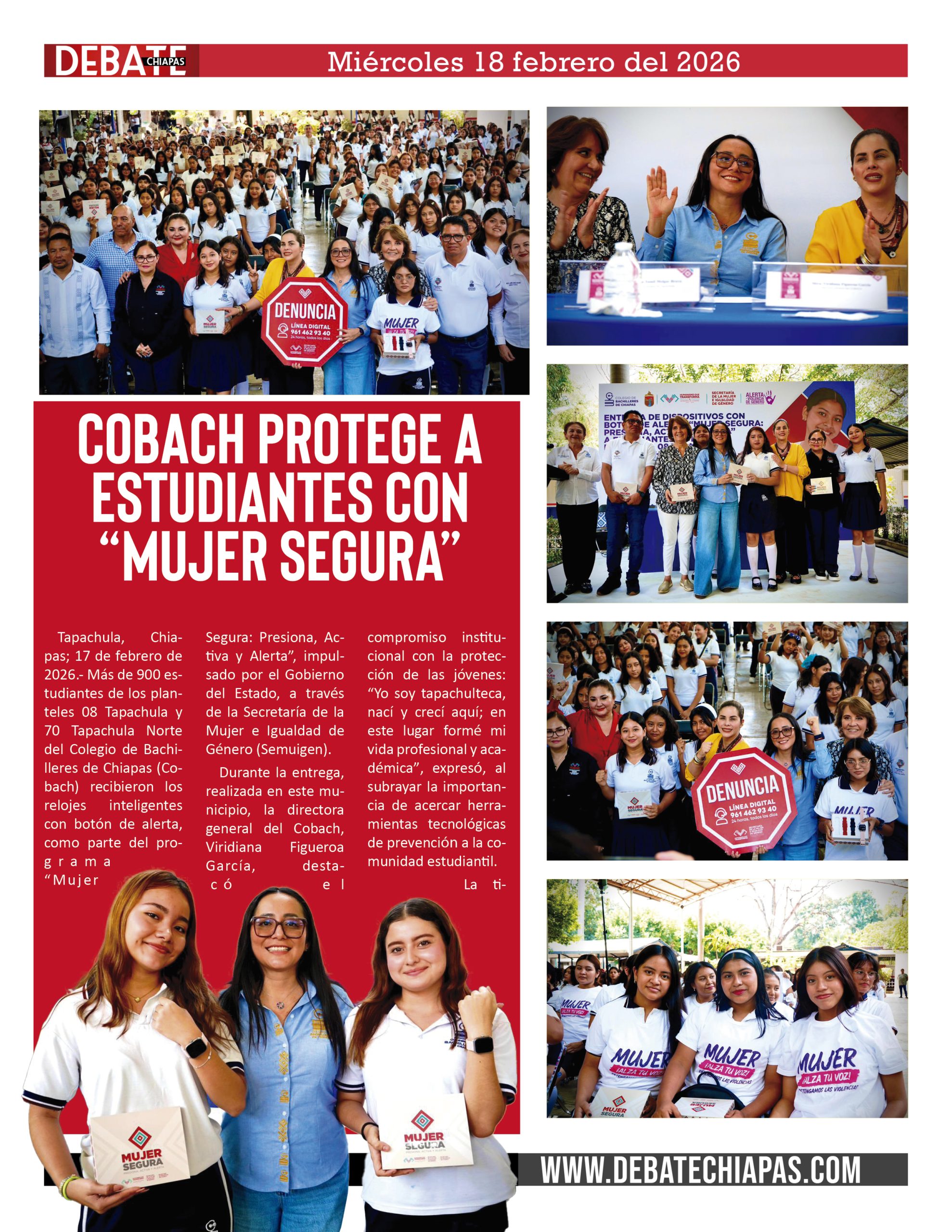 Tapachula, Chiapas; 17 de febrero de 2026.- Más de 900 estudiantes de los planteles 08 Tapachula y 70 Tapachula Norte del Colegio de Bachilleres de Chiapas (Cobach) recibieron los relojes inteligentes con botón de alerta, como parte del programa «Mujer Segura: Presiona, Activa y Alerta», impulsado por el Gobierno del Estado, a través de la Secretaría de la Mujer e Igualdad de Género (Semuigen).