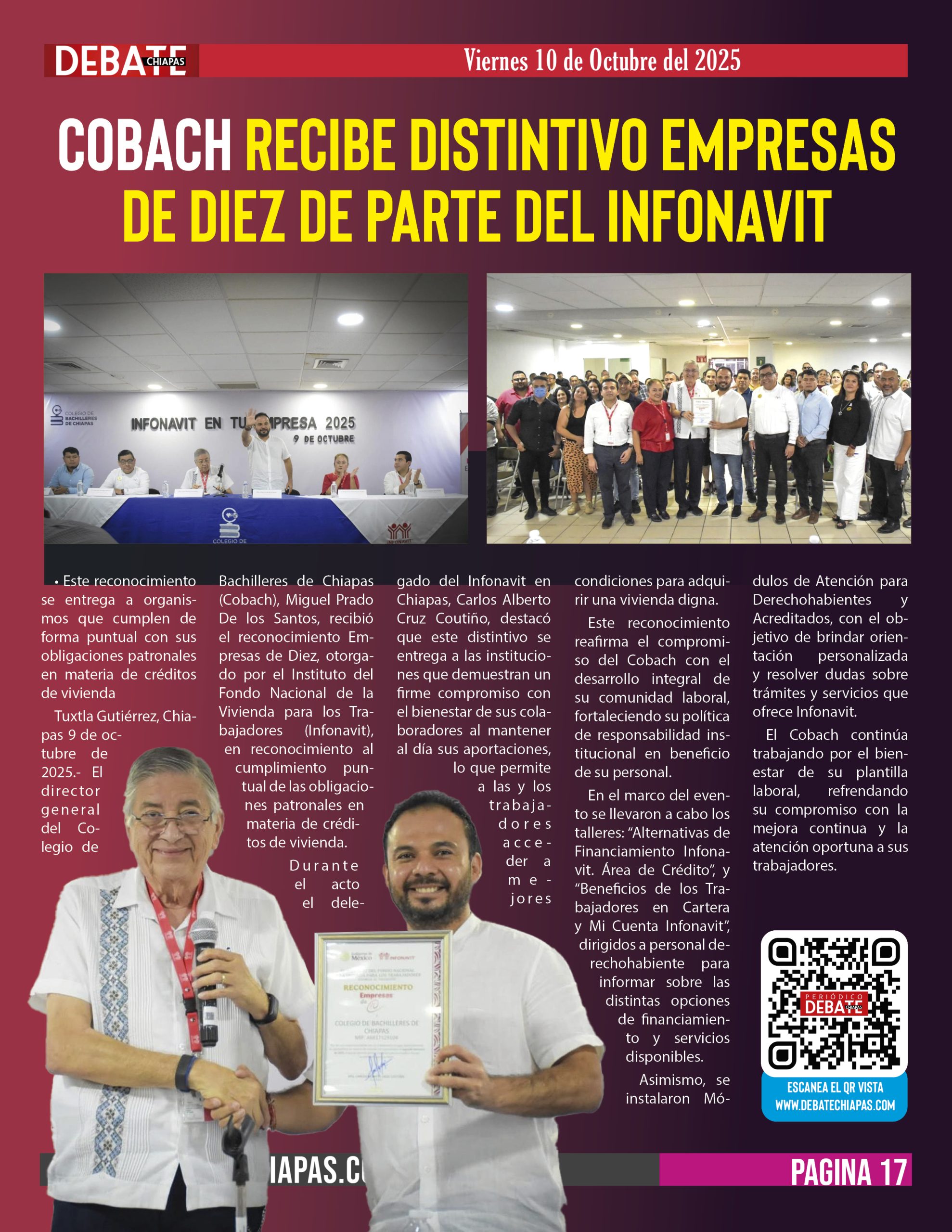 Tuxtla Gutiérrez, Chiapas 9 de octubre de 2025.- El director general del Colegio de Bachilleres de Chiapas (Cobach), Miguel Prado De los Santos, recibió el reconocimiento Empresas de Diez, otorgado por el Instituto del Fondo Nacional de la Vivienda para los Trabajadores (Infonavit), en reconocimiento al cumplimiento puntual de las obligaciones patronales en materia de créditos de vivienda.