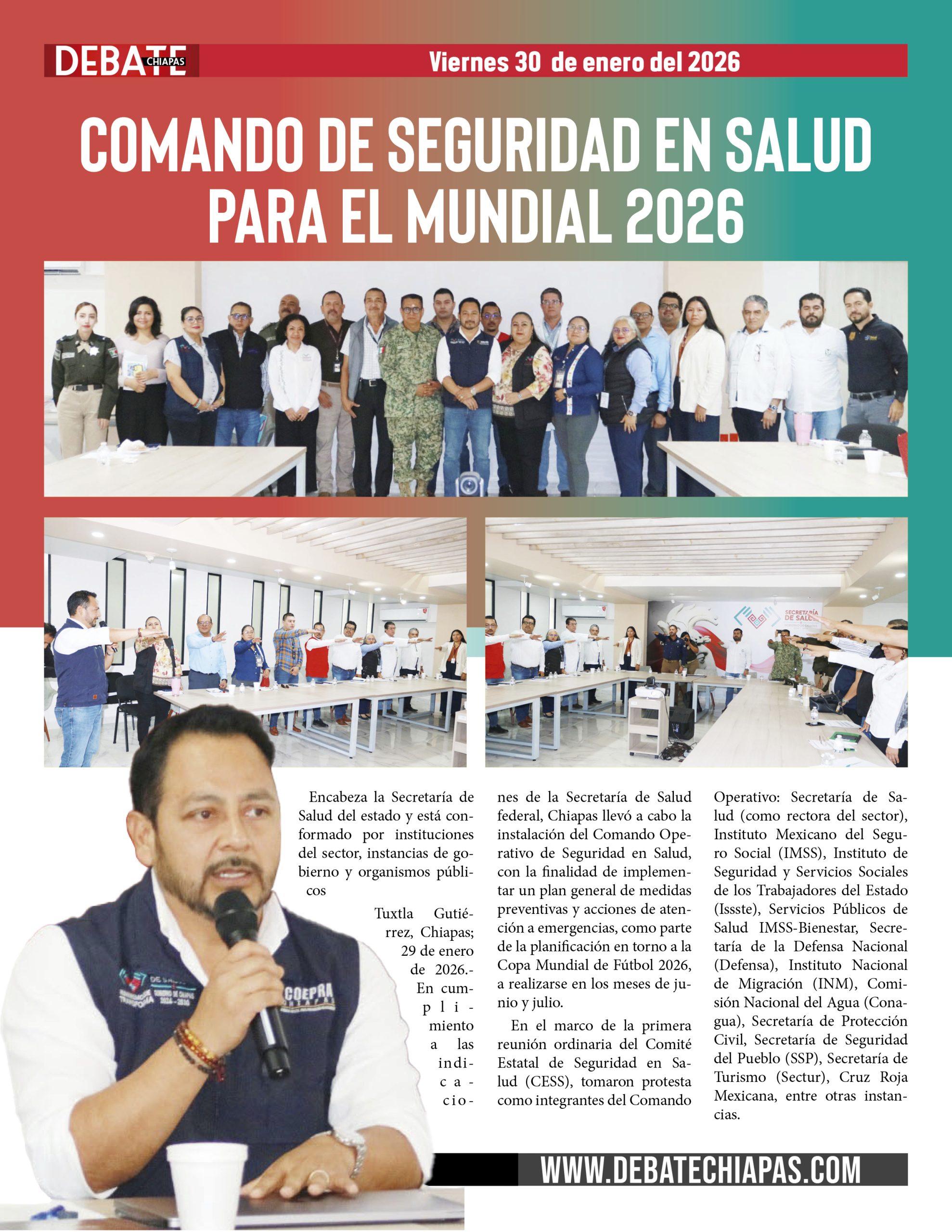 Tuxtla Gutiérrez, Chiapas; 29 de enero de 2026.- En cumplimiento a las indicaciones de la Secretaría de Salud federal, Chiapas llevó a cabo la instalación del Comando Operativo de Seguridad en Salud, con la finalidad de implementar un plan general de medidas preventivas y acciones de atención a emergencias, como parte de la planificación en torno a la Copa Mundial de Fútbol 2026, a realizarse en los meses de junio y julio.