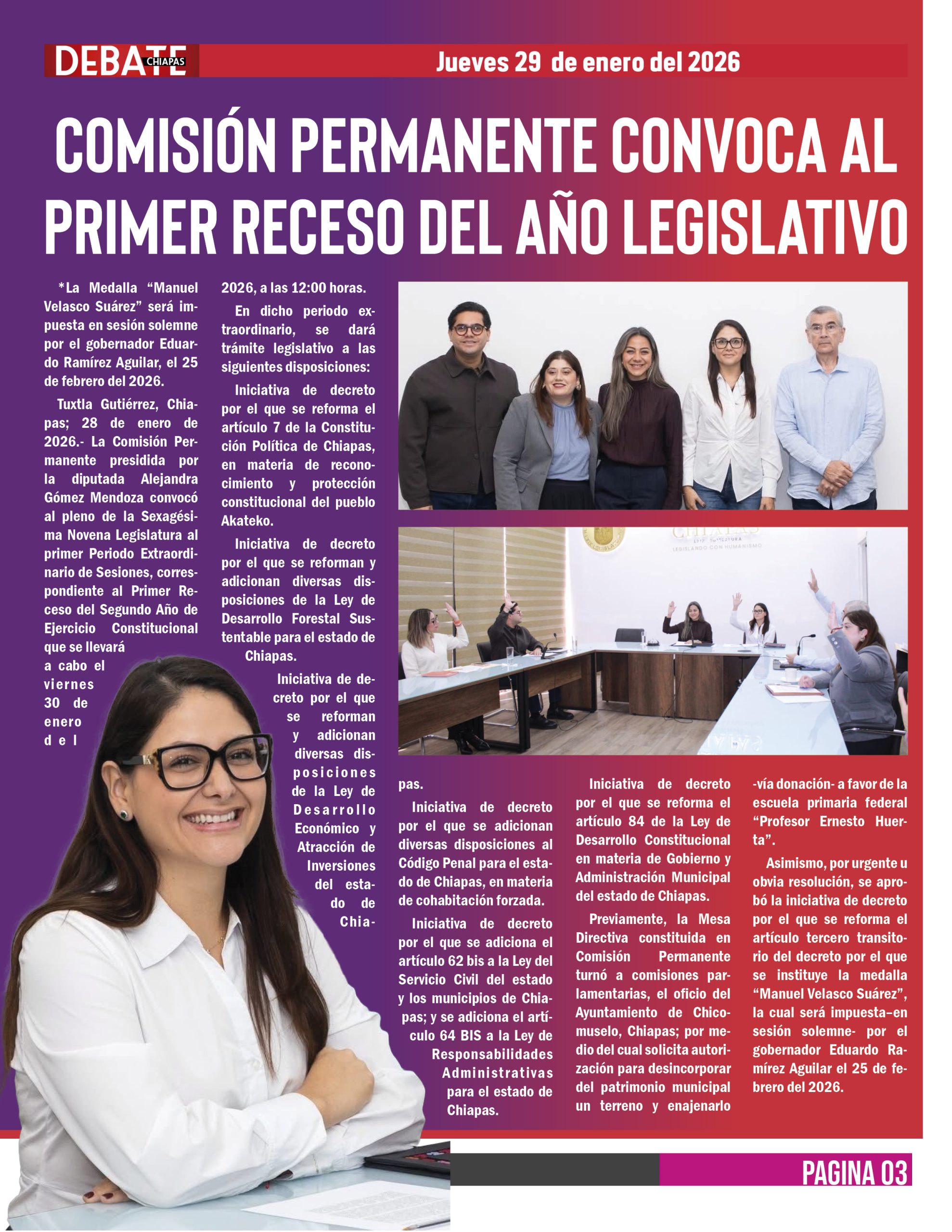 Tuxtla Gutiérrez, Chiapas; 28 de enero de 2026.- La Comisión Permanente presidida por la diputada Alejandra Gómez Mendoza convocó al pleno de la Sexagésima Novena Legislatura al primer Periodo Extraordinario de Sesiones, correspondiente al Primer Receso del Segundo Año de Ejercicio Constitucional que se llevará a cabo el viernes 30 de enero del 2026, a las 12:00 horas.