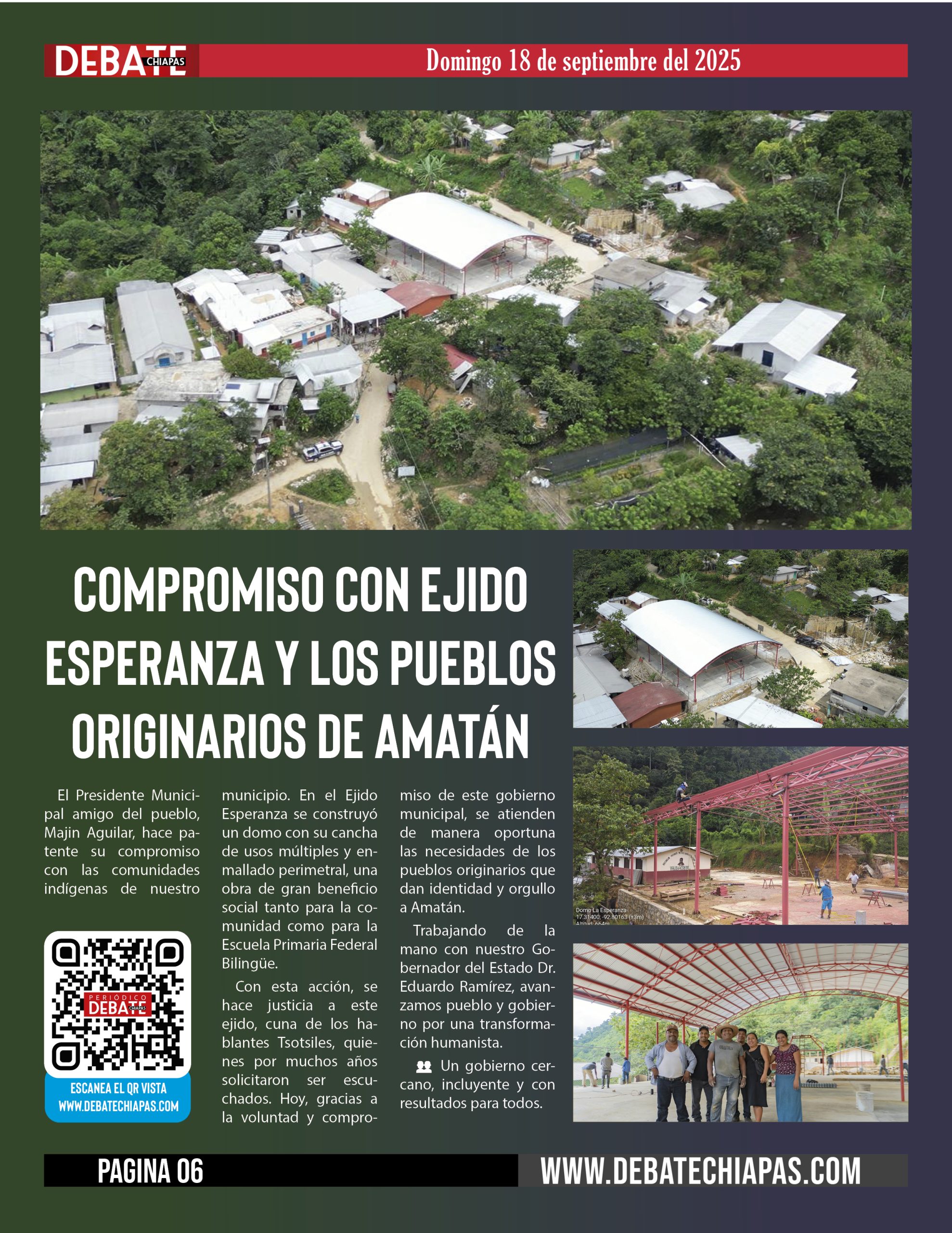 El Presidente Municipal amigo del pueblo, Majin Aguilar, hace patente su compromiso con las comunidades indígenas de nuestro municipio. En el Ejido Esperanza se construyó un domo con su cancha de usos múltiples y enmallado perimetral, una obra de gran beneficio social tanto para la comunidad como para la Escuela Primaria Federal Bilingüe.