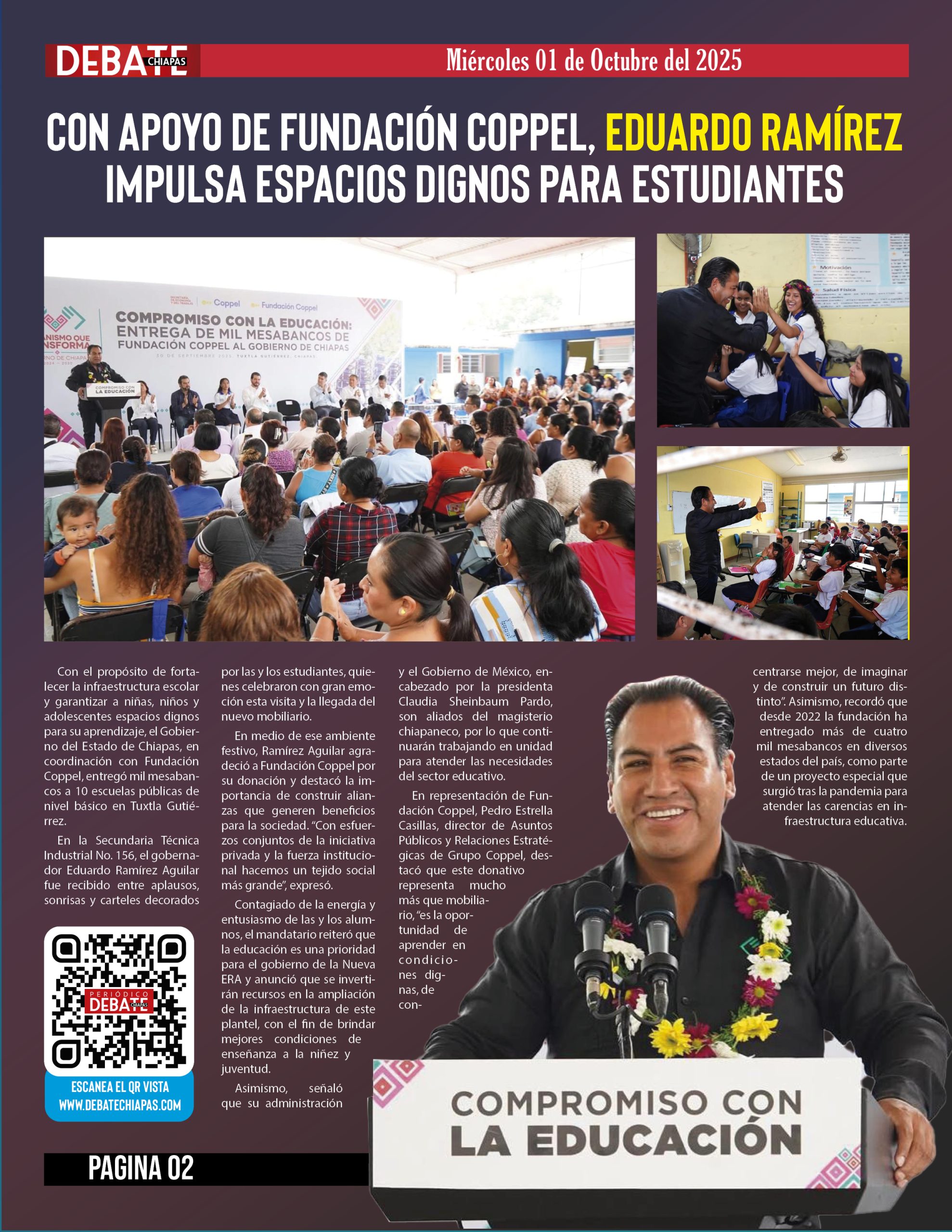 Con el propósito de fortalecer la infraestructura escolar y garantizar a niñas, niños y adolescentes espacios dignos para su aprendizaje, el Gobierno del Estado de Chiapas, en coordinación con Fundación Coppel, entregó mil mesabancos a 10 escuelas públicas de nivel básico en Tuxtla Gutiérrez.