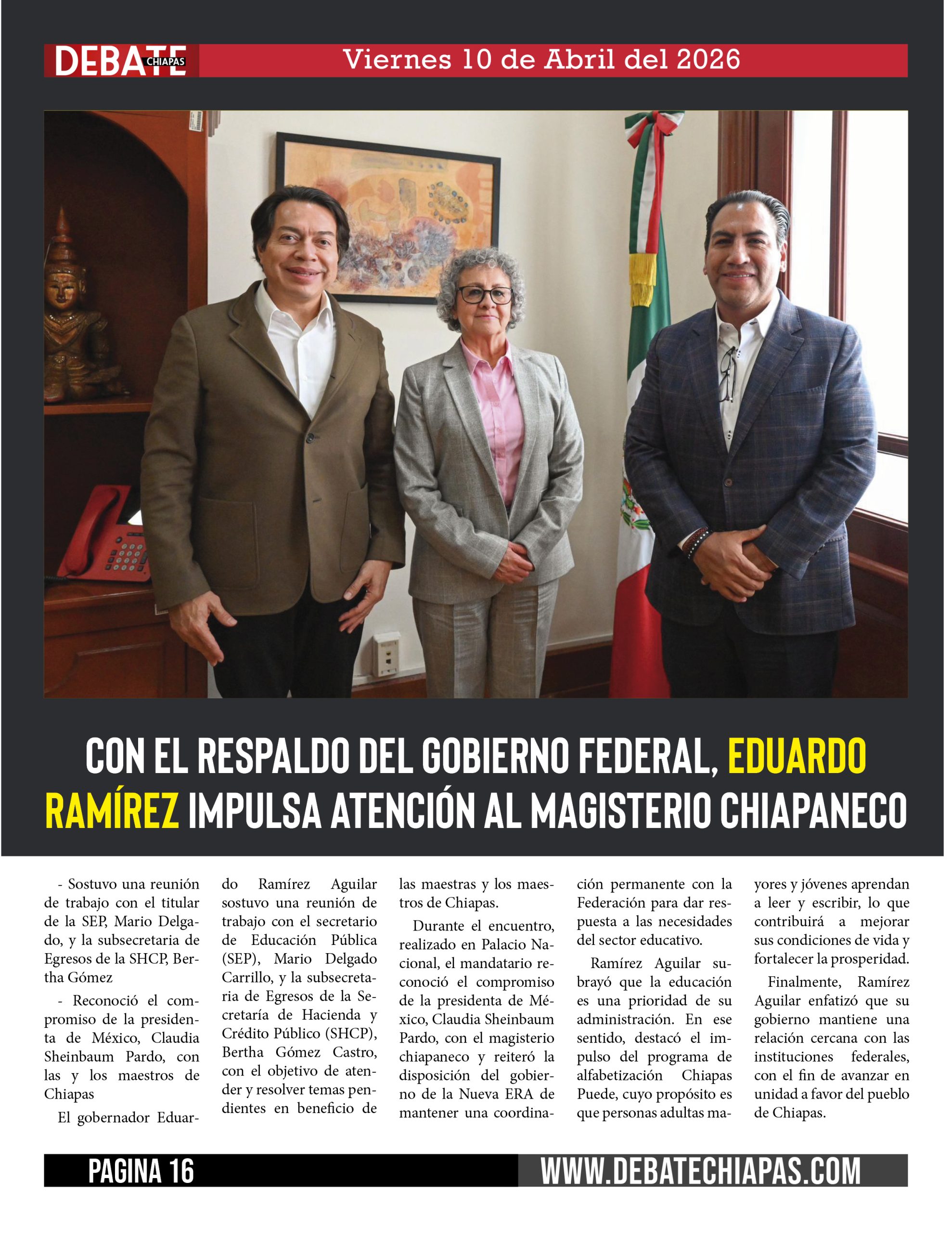 El gobernador Eduardo Ramírez Aguilar sostuvo una reunión de trabajo con el secretario de Educación Pública (SEP), Mario Delgado Carrillo, y la subsecretaria de Egresos de la Secretaría de Hacienda y Crédito Público (SHCP), Bertha Gómez Castro, con el objetivo de atender y resolver temas pendientes en beneficio de las maestras y los maestros de Chiapas.