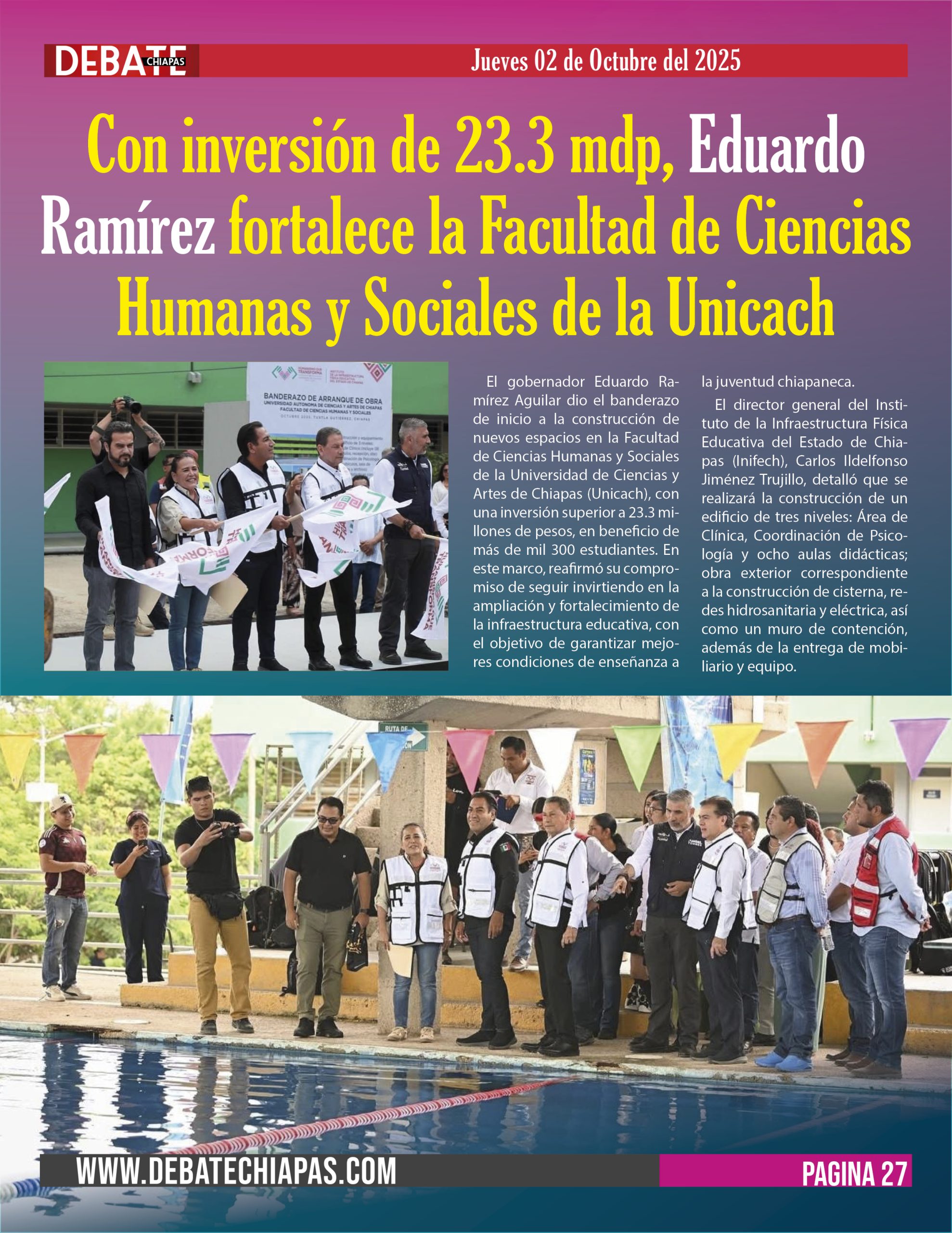 El director general del Instituto de la Infraestructura Física Educativa del Estado de Chiapas (Inifech), Carlos Ildelfonso Jiménez Trujillo, detalló que se realizará la construcción de un edificio de tres niveles: Área de Clínica, Coordinación de Psicología y ocho aulas didácticas; obra exterior correspondiente a la construcción de cisterna, redes hidrosanitaria y eléctrica, así como un muro de contención, además de la entrega de mobiliario y equipo.