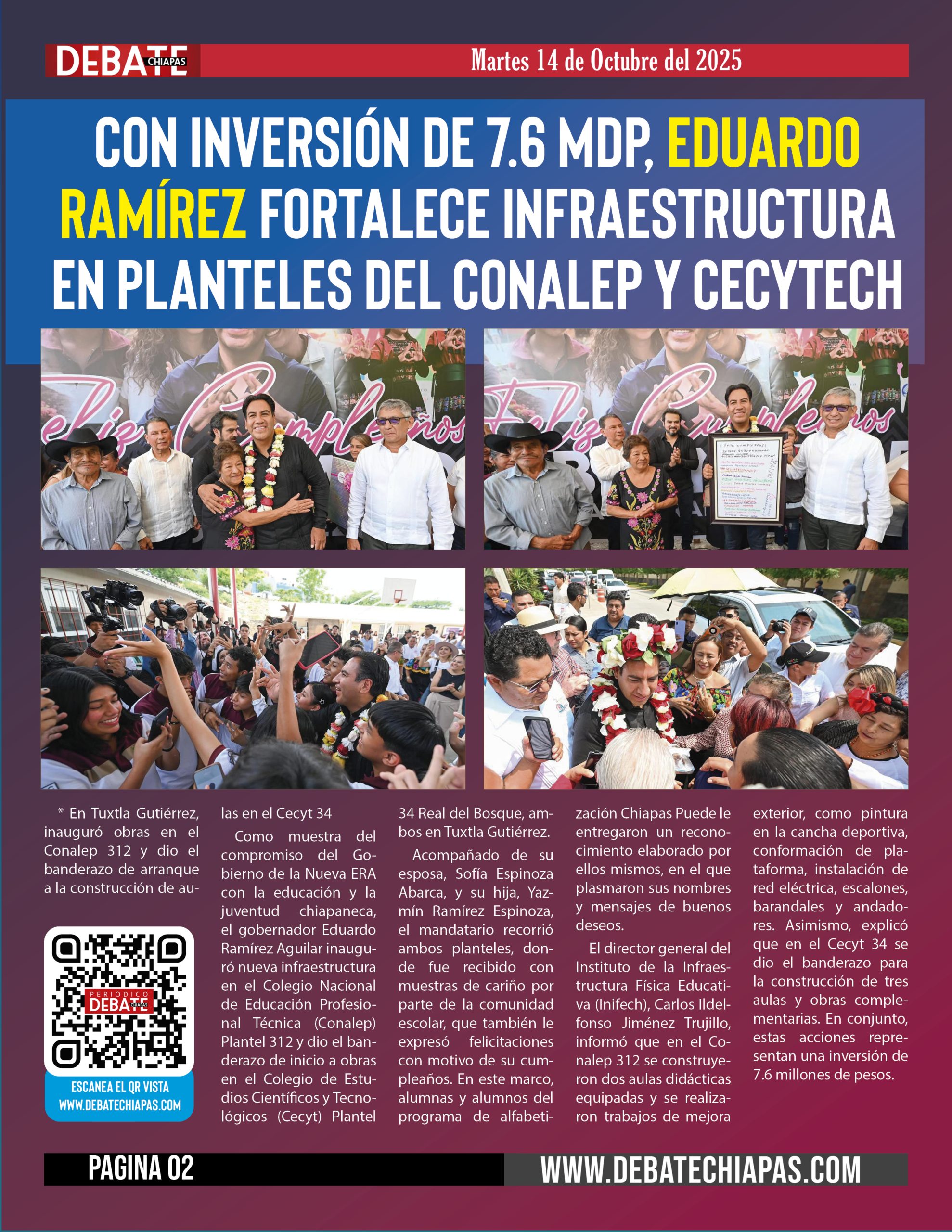 Como muestra del compromiso del Gobierno de la Nueva ERA con la educación y la juventud chiapaneca, el gobernador Eduardo Ramírez Aguilar inauguró nueva infraestructura en el Colegio Nacional de Educación Profesional Técnica (Conalep) Plantel 312 y dio el banderazo de inicio a obras en el Colegio de Estudios Científicos y Tecnológicos (Cecyt) Plantel 34 Real del Bosque, ambos en Tuxtla Gutiérrez.