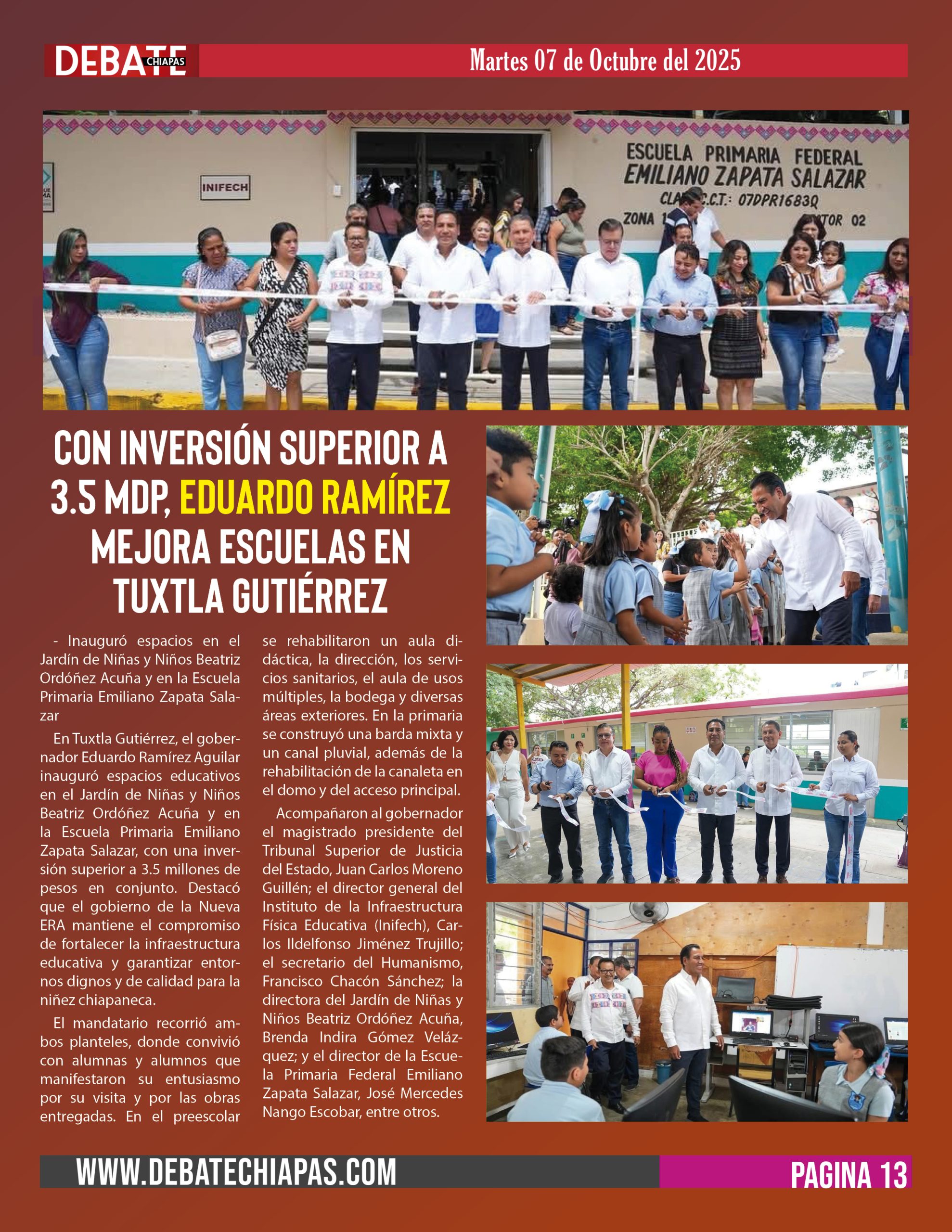 En Tuxtla Gutiérrez, el gobernador Eduardo Ramírez Aguilar inauguró espacios educativos en el Jardín de Niñas y Niños Beatriz Ordóñez Acuña y en la Escuela Primaria Emiliano Zapata Salazar, con una inversión superior a 3.5 millones de pesos en conjunto. Destacó que el gobierno de la Nueva ERA mantiene el compromiso de fortalecer la infraestructura educativa y garantizar entornos dignos y de calidad para la niñez chiapaneca.