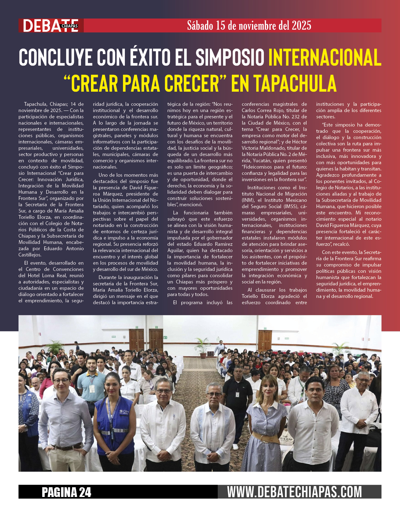 Tapachula, Chiapas; 14 de noviembre de 2025. — Con la participación de especialistas nacionales e internacionales, representantes de instituciones públicas, organismos internacionales, cámaras empresariales, universidades, sector productivo y personas en contexto de movilidad, concluyó con éxito el Simposio Internacional “Crear para Crecer: Innovación Jurídica, Integración de la Movilidad Humana y Desarrollo en la Frontera Sur”, organizado por la Secretaría de la Frontera Sur, a cargo de María Amalia Toriello Elorza, en coordinación con el Colegio de Notarios Públicos de la Costa de Chiapas y la Subsecretaría de Movilidad Humana, encabezada por Eduardo Antonio Castillejos.