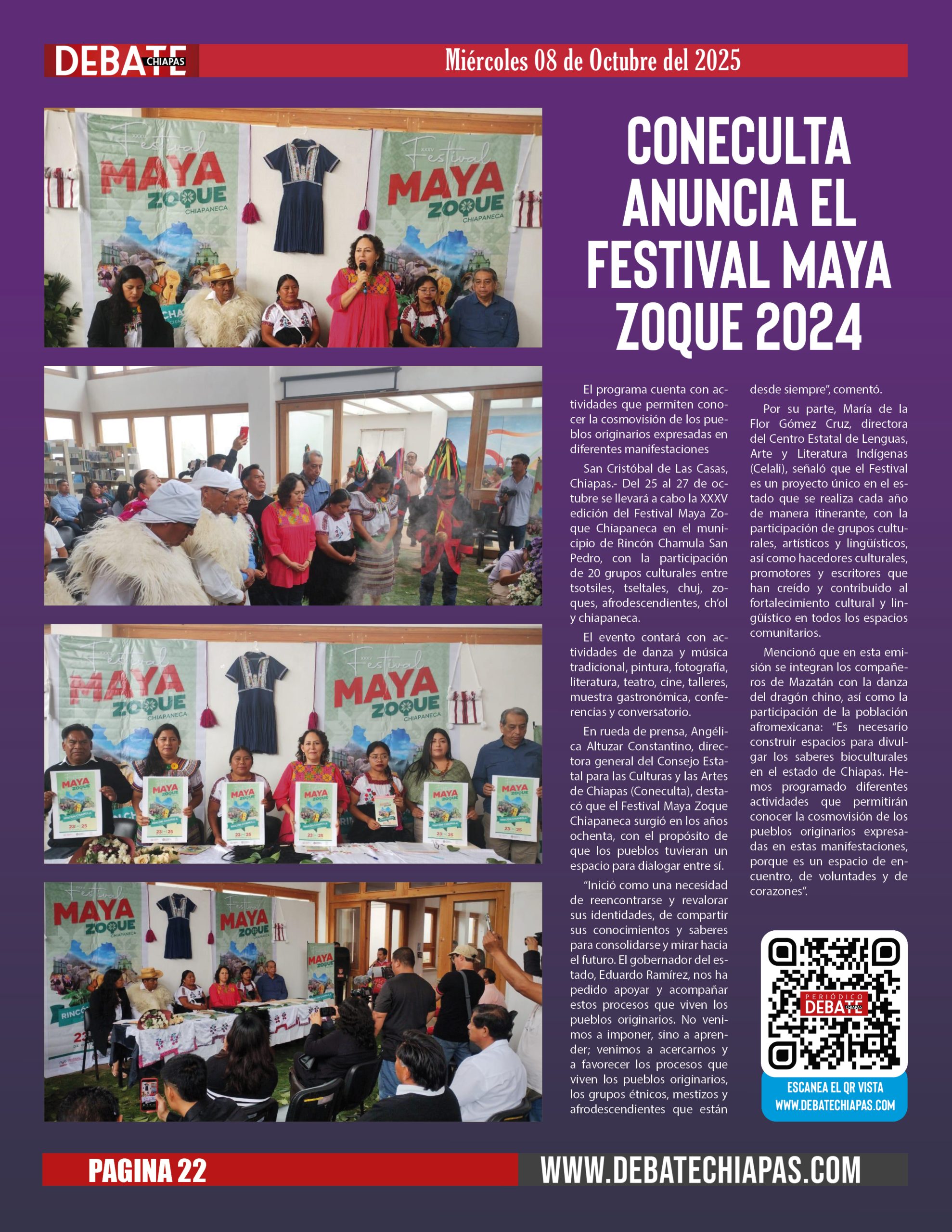 En rueda de prensa, Angélica Altuzar Constantino, directora general del Consejo Estatal para las Culturas y las Artes de Chiapas (Coneculta), destacó que el Festival Maya Zoque Chiapaneca surgió en los años ochenta, con el propósito de que los pueblos tuvieran un espacio para dialogar entre sí.