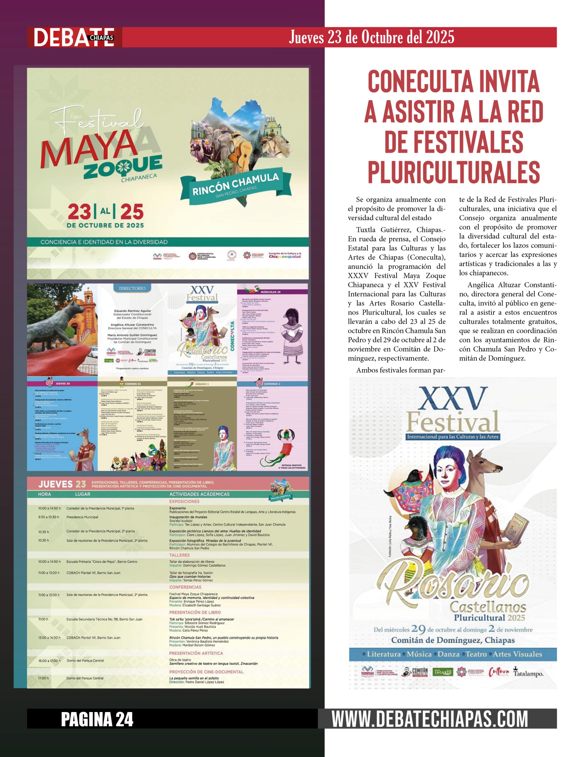 Tuxtla Gutiérrez, Chiapas.- En rueda de prensa, el Consejo Estatal para las Culturas y las Artes de Chiapas (Coneculta), anunció la programación del XXXV Festival Maya Zoque Chiapaneca y el XXV Festival Internacional para las Culturas y las Artes Rosario Castellanos Pluricultural, los cuales se llevarán a cabo del 23 al 25 de octubre en Rincón Chamula San Pedro y del 29 de octubre al 2 de noviembre en Comitán de Domínguez, respectivamente.