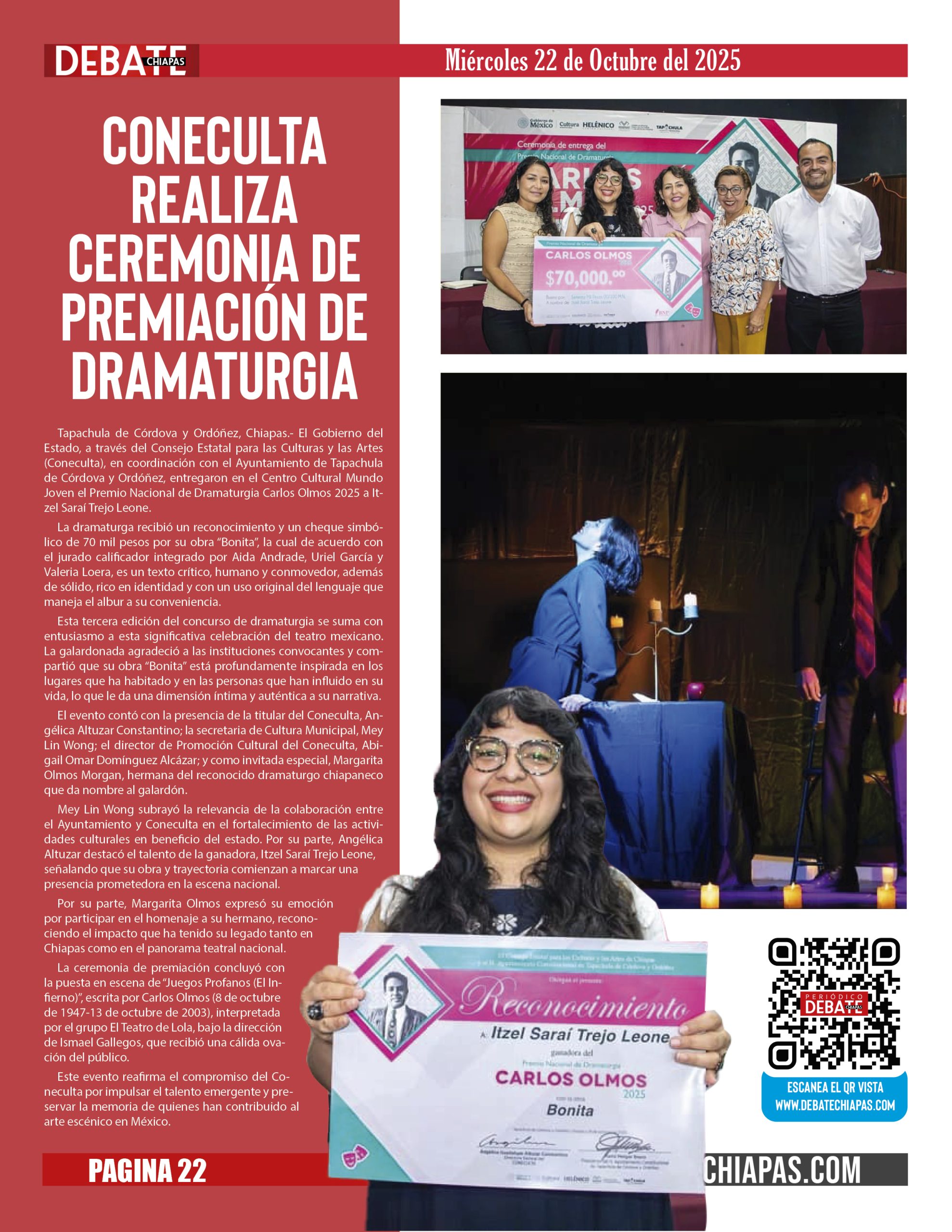 Tapachula de Córdova y Ordóñez, Chiapas.- El Gobierno del Estado, a través del Consejo Estatal para las Culturas y las Artes (Coneculta), en coordinación con el Ayuntamiento de Tapachula de Córdova y Ordóñez, entregaron en el Centro Cultural Mundo Joven el Premio Nacional de Dramaturgia Carlos Olmos 2025 a Itzel Saraí Trejo Leone.