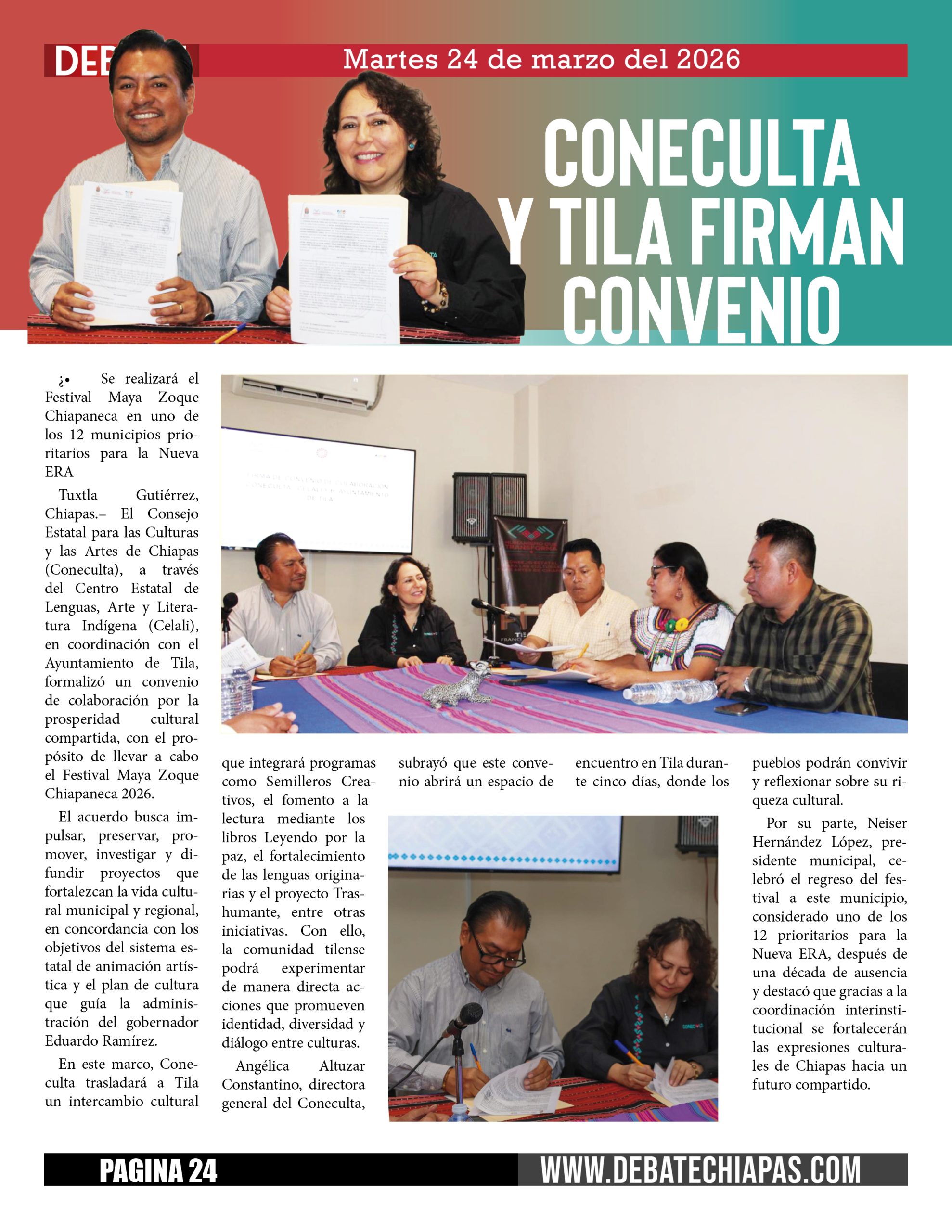 Tuxtla Gutiérrez, Chiapas.– El Consejo Estatal para las Culturas y las Artes de Chiapas (Coneculta), a través del Centro Estatal de Lenguas, Arte y Literatura Indígena (Celali), en coordinación con el Ayuntamiento de Tila, formalizó un convenio de colaboración por la prosperidad cultural compartida, con el propósito de llevar a cabo el Festival Maya Zoque Chiapaneca 2026.