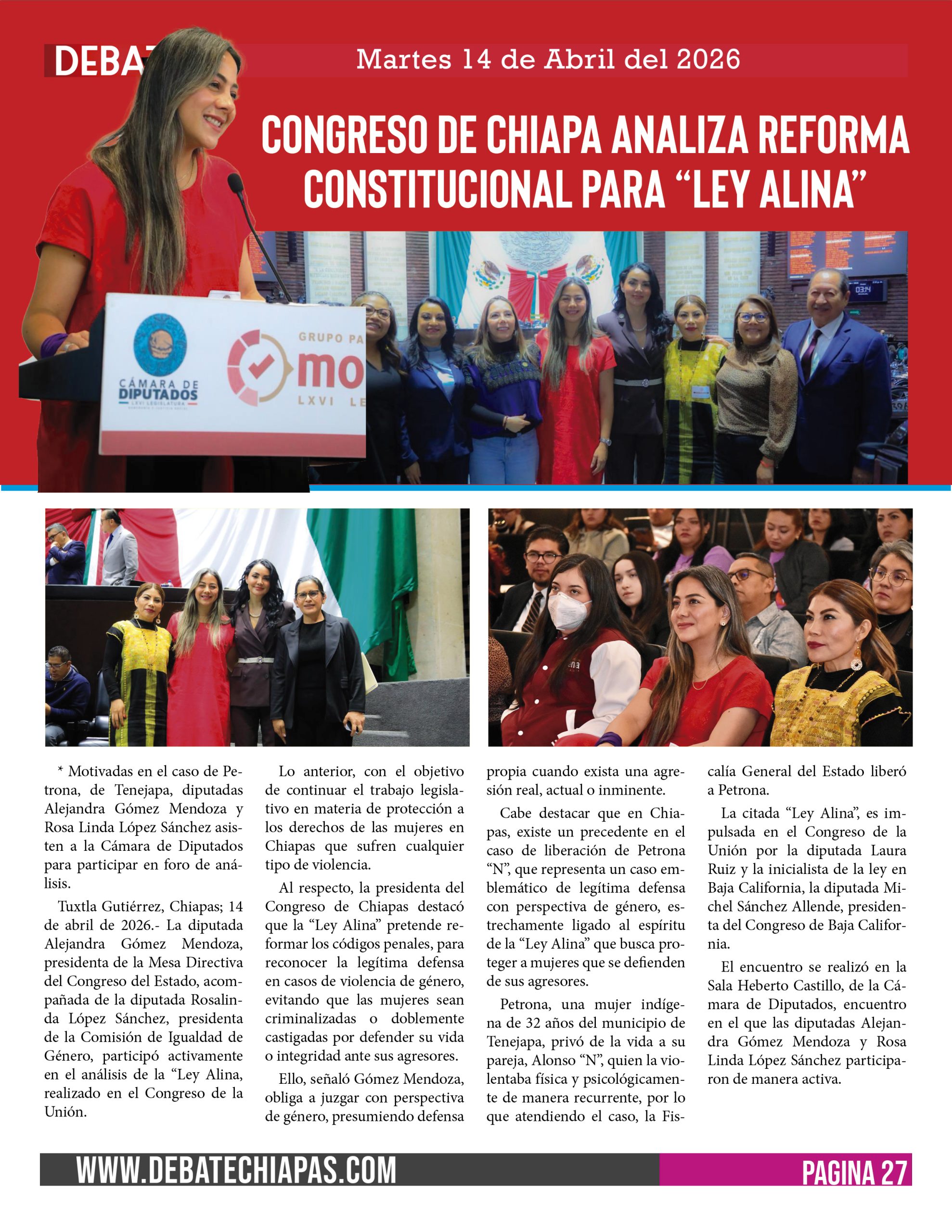 Tuxtla Gutiérrez, Chiapas; 14 de abril de 2026.- La diputada Alejandra Gómez Mendoza, presidenta de la Mesa Directiva del Congreso del Estado, acompañada de la diputada Rosalinda López Sánchez, presidenta de la Comisión de Igualdad de Género, participó activamente en el análisis de la “Ley Alina, realizado en el Congreso de la Unión.