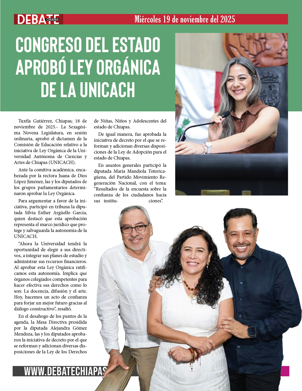 Para argumentar a favor de la iniciativa, participó en tribuna la diputada Silvia Esther Argüello García, quien destacó que esta aprobación representa el marco jurídico que protege y salvaguarda la autonomía de la UNICACH.
