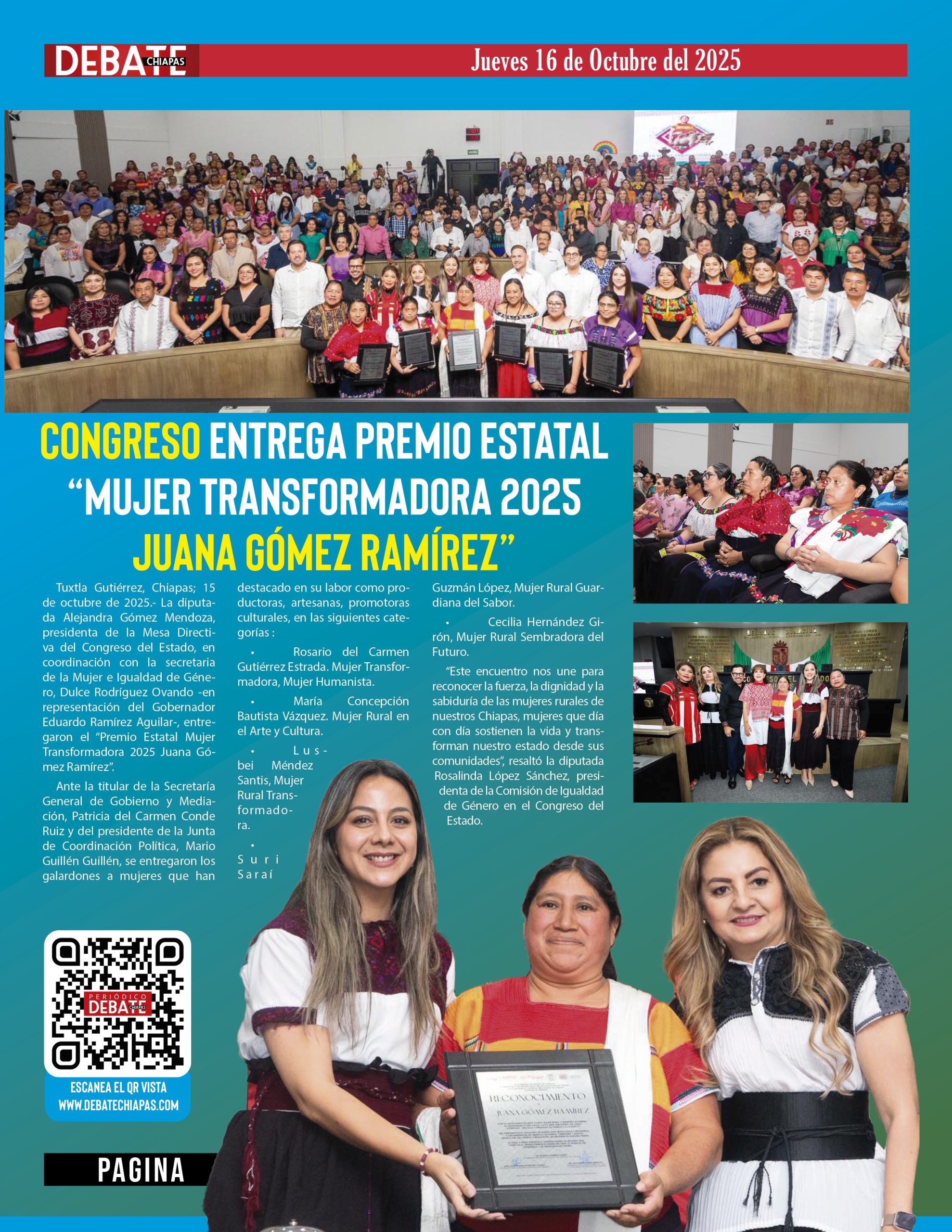Tuxtla Gutiérrez, Chiapas; 15 de octubre de 2025.- La diputada Alejandra Gómez Mendoza, presidenta de la Mesa Directiva del Congreso del Estado, en coordinación con la secretaria de la Mujer e Igualdad de Género, Dulce Rodríguez Ovando -en representación del Gobernador Eduardo Ramírez Aguilar-, entregaron el “Premio Estatal Mujer Transformadora 2025 Juana Gómez Ramírez”.