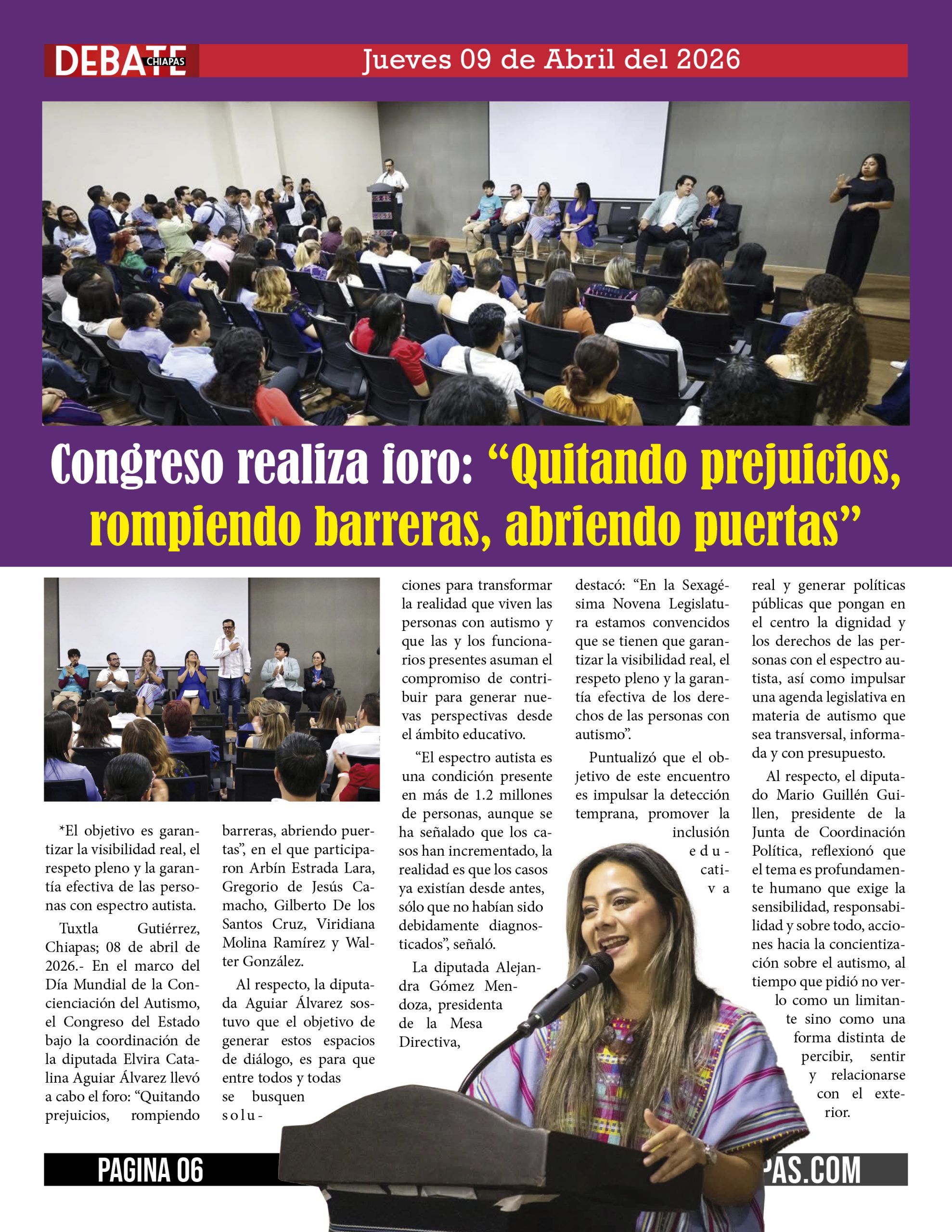 Tuxtla Gutiérrez, Chiapas; 08 de abril de 2026.- En el marco del Día Mundial de la Concienciación del Autismo, el Congreso del Estado bajo la coordinación de la diputada Elvira Catalina Aguiar Álvarez llevó a cabo el foro: “Quitando prejuicios, rompiendo barreras, abriendo puertas”, en el que participaron Arbín Estrada Lara, Gregorio de Jesús Camacho, Gilberto De los Santos Cruz, Viridiana Molina Ramírez y Walter González.