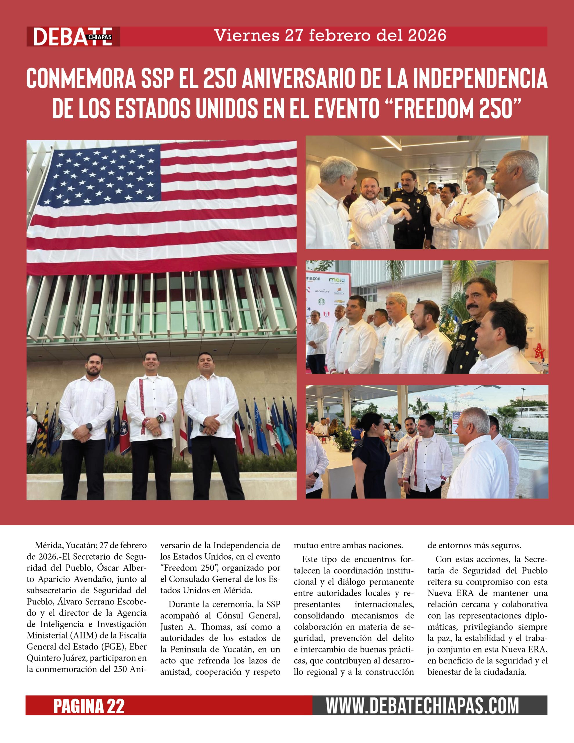 Mérida, Yucatán; 27 de febrero de 2026.-El Secretario de Seguridad del Pueblo, Óscar Alberto Aparicio Avendaño, junto al subsecretario de Seguridad del Pueblo, Álvaro Serrano Escobedo y el director de la Agencia de Inteligencia e Investigación Ministerial (AIIM) de la Fiscalía General del Estado (FGE), Eber Quintero Juárez, participaron en la conmemoración del 250 Aniversario de la Independencia de los Estados Unidos, en el evento “Freedom 250”, organizado por el Consulado General de los Estados Unidos en Mérida.