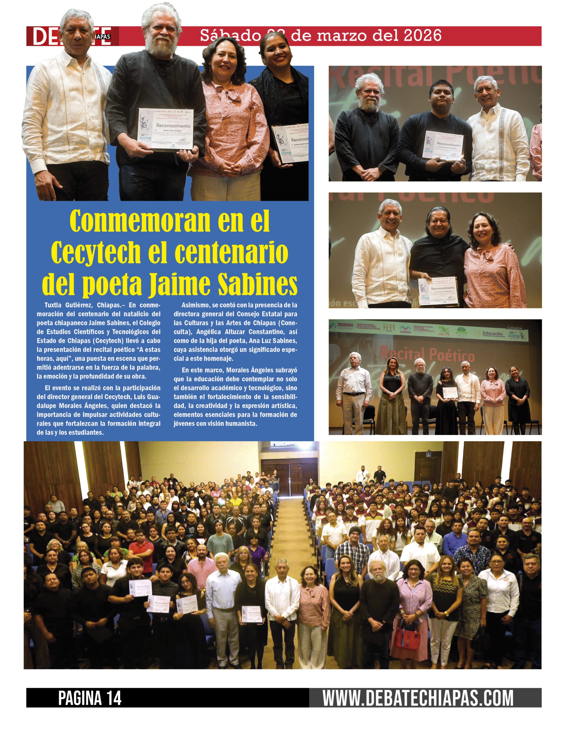 Tuxtla Gutiérrez, Chiapas.– En conmemoración del centenario del natalicio del poeta chiapaneco Jaime Sabines, el Colegio de Estudios Científicos y Tecnológicos del Estado de Chiapas (Cecytech) llevó a cabo la presentación del recital poético “A estas horas, aquí”, una puesta en escena que permitió adentrarse en la fuerza de la palabra, la emoción y la profundidad de su obra.