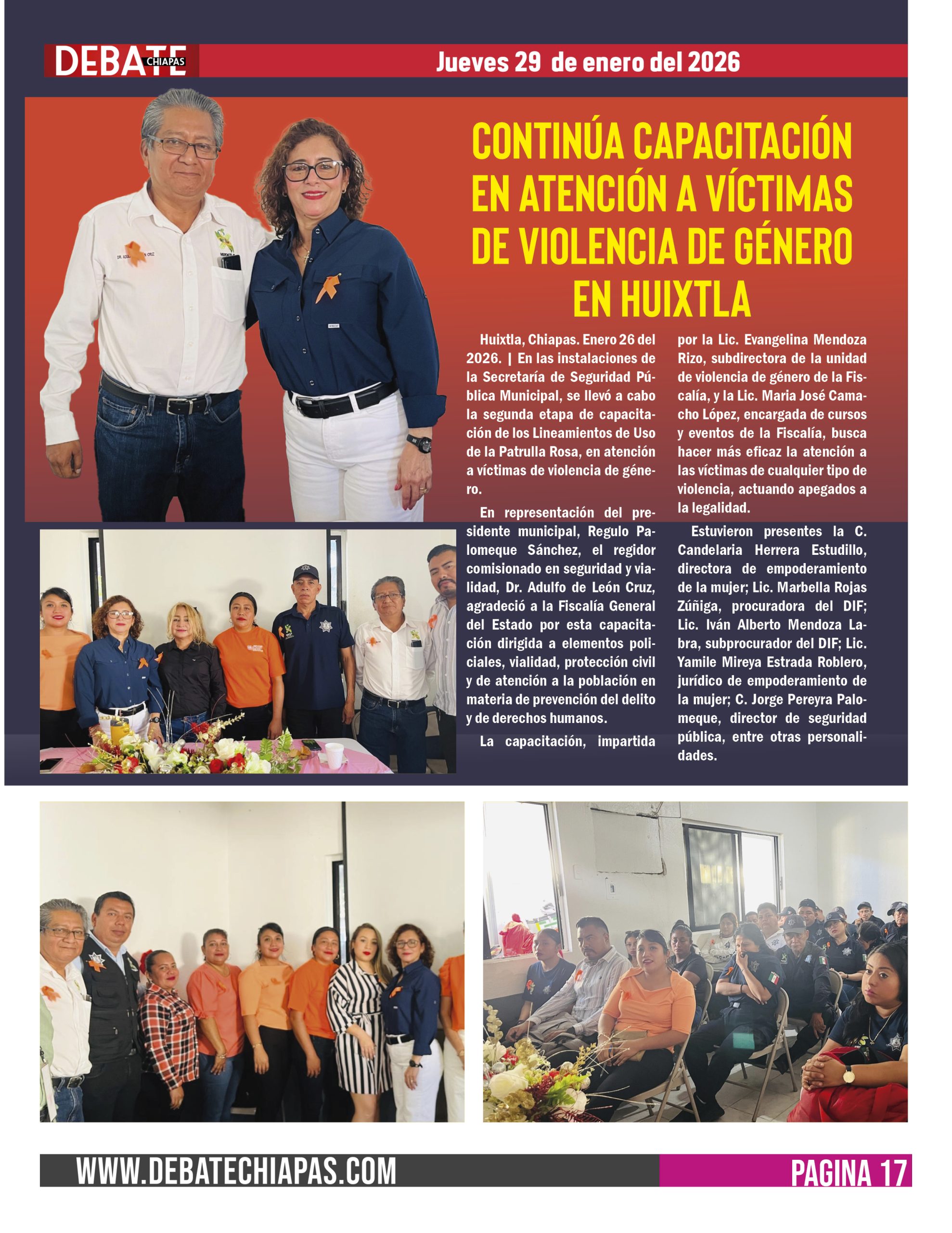 Estuvieron presentes la C. Candelaria Herrera Estudillo, directora de empoderamiento de la mujer; Lic. Marbella Rojas Zúñiga, procuradora del DIF; Lic. Iván Alberto Mendoza Labra, subprocurador del DIF; Lic. Yamile Mireya Estrada Roblero, jurídico de empoderamiento de la mujer; C. Jorge Pereyra Palomeque, director de seguridad pública, entre otras personalidades.
