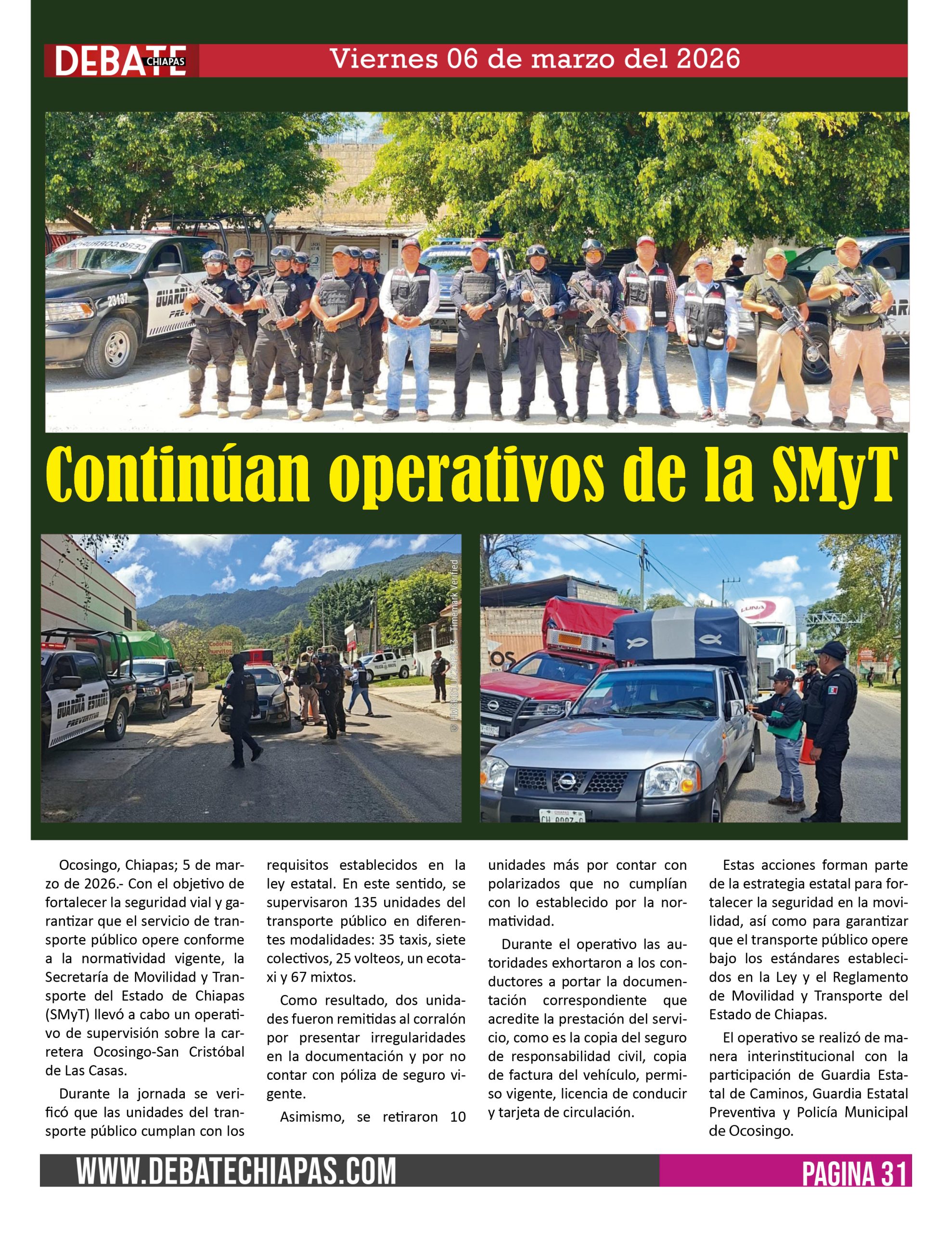 Ocosingo, Chiapas; 5 de marzo de 2026.- Con el objetivo de fortalecer la seguridad vial y garantizar que el servicio de transporte público opere conforme a la normatividad vigente, la Secretaría de Movilidad y Transporte del Estado de Chiapas (SMyT) llevó a cabo un operativo de supervisión sobre la carretera Ocosingo-San Cristóbal de Las Casas.