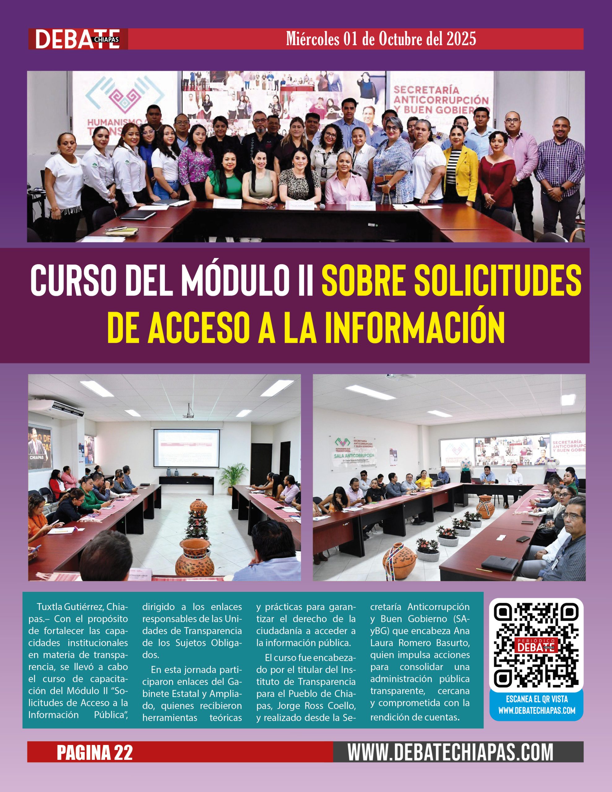 El curso fue encabezado por el titular del Instituto de Transparencia para el Pueblo de Chiapas, Jorge Ross Coello, y realizado desde la Secretaría Anticorrupción y Buen Gobierno (SAyBG) que encabeza Ana Laura Romero Basurto, quien impulsa acciones para consolidar una administración pública transparente, cercana y comprometida con la rendición de cuentas.