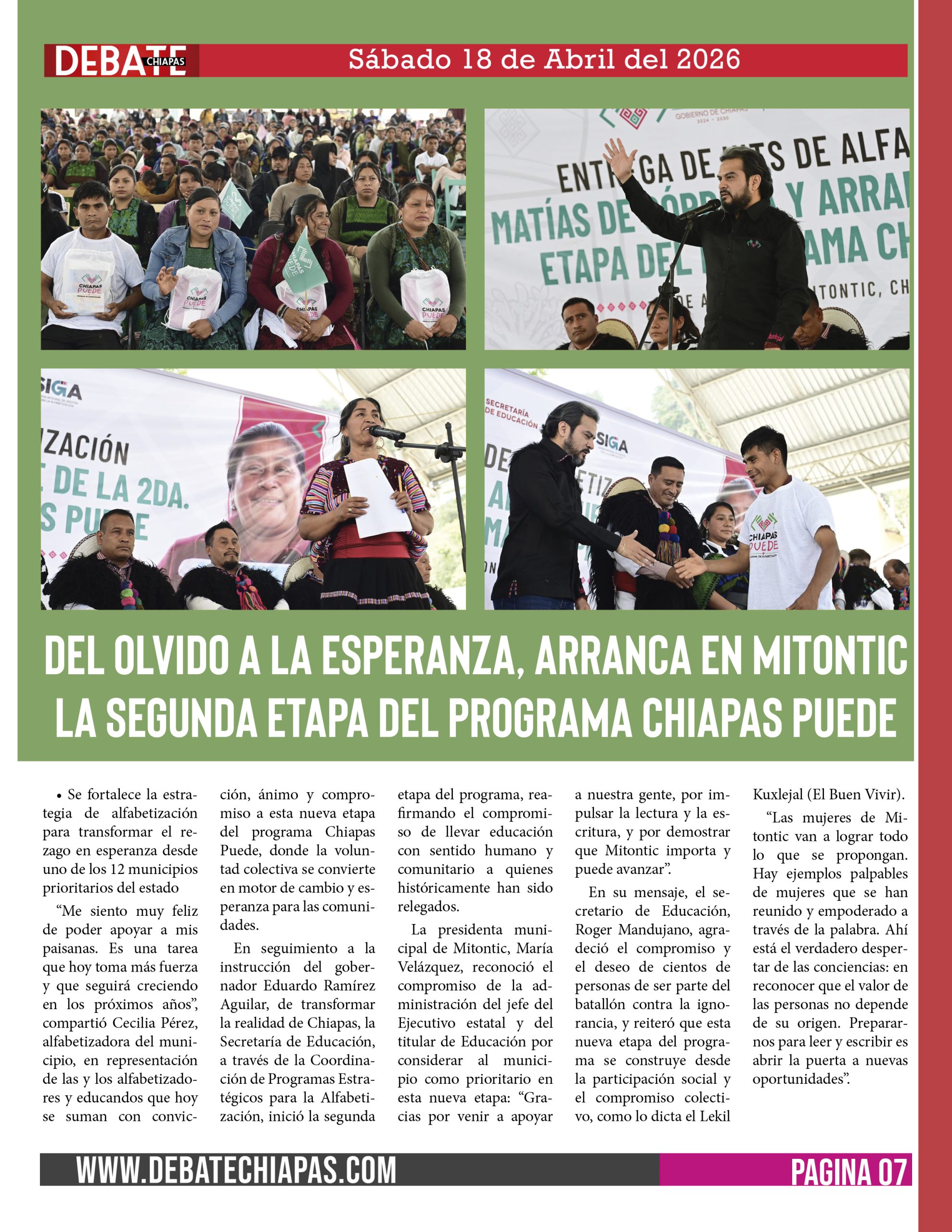 Esta segunda etapa de Chiapas Puede simboliza un proceso profundo de transformación social que comienza en las comunidades y se proyecta hacia todo el estado: pasar del silencio a la voz, de la exclusión a la participación, del rezago a la dignidad. Hoy, Chiapas escribe una nueva historia donde aprender a leer y escribir no solo es adquirir conocimientos, sino recuperar la esperanza, fortalecer la identidad y abrir camino a un futuro más justo e incluyente para todas y todos.