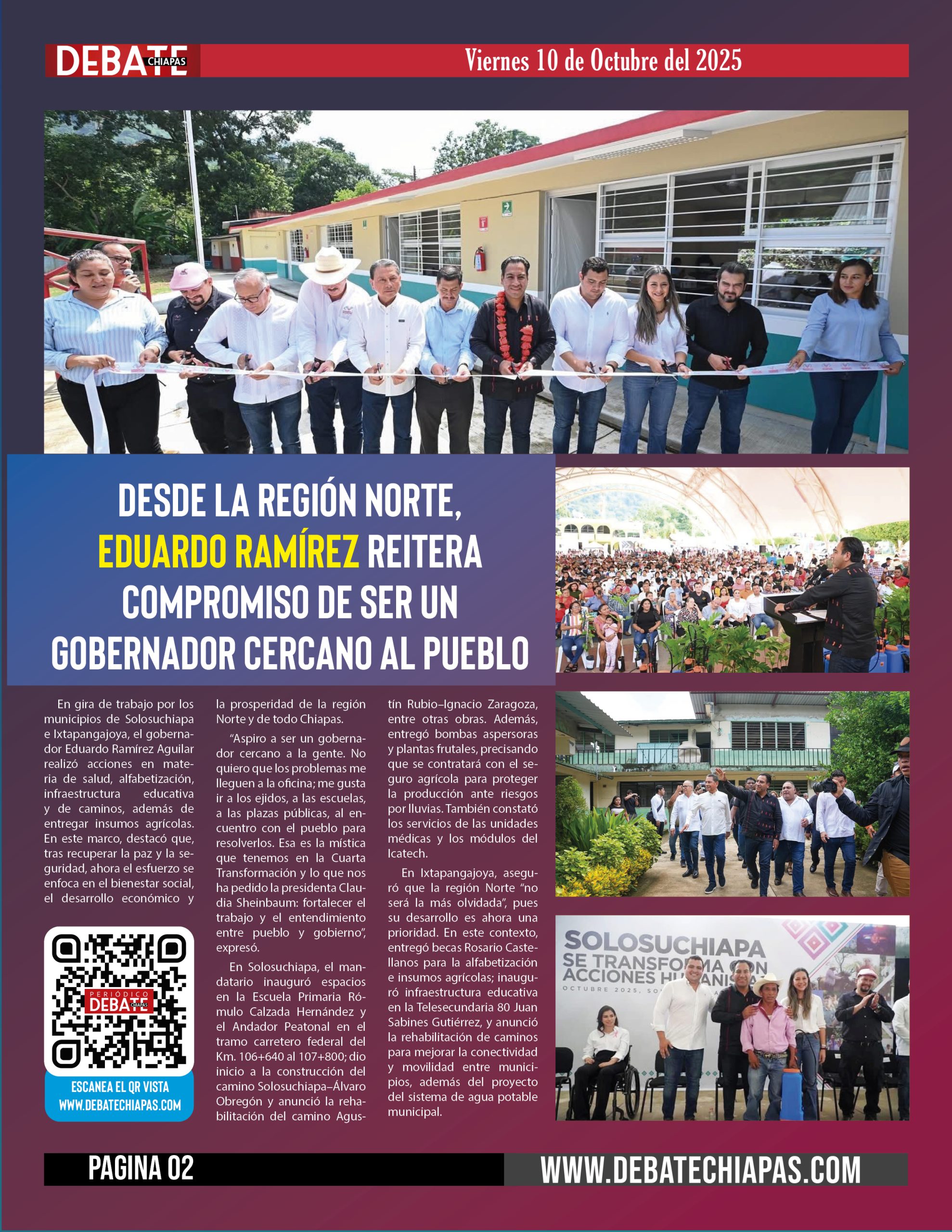 En Ixtapangajoya, aseguró que la región Norte “no será la más olvidada”, pues su desarrollo es ahora una prioridad. En este contexto, entregó becas Rosario Castellanos para la alfabetización e insumos agrícolas; inauguró infraestructura educativa en la Telesecundaria 80 Juan Sabines Gutiérrez, y anunció la rehabilitación de caminos para mejorar la conectividad y movilidad entre municipios, además del proyecto del sistema de agua potable municipal.