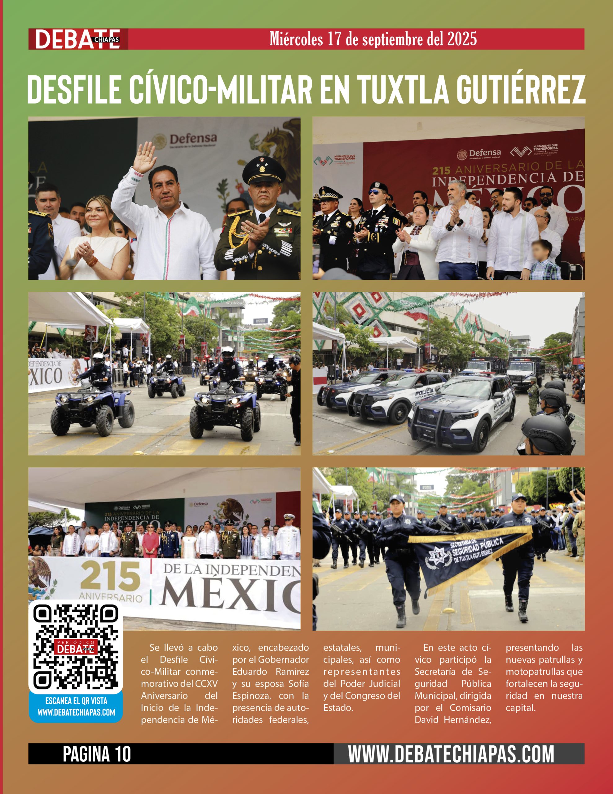 Se llevó a cabo el Desfile Cívico-Militar conmemorativo del CCXV Aniversario del Inicio de la Independencia de México, encabezado por el Gobernador Eduardo Ramírez y su esposa Sofía Espinoza, con la presencia de autoridades federales, estatales, municipales, así como representantes del Poder Judicial y del Congreso del Estado.