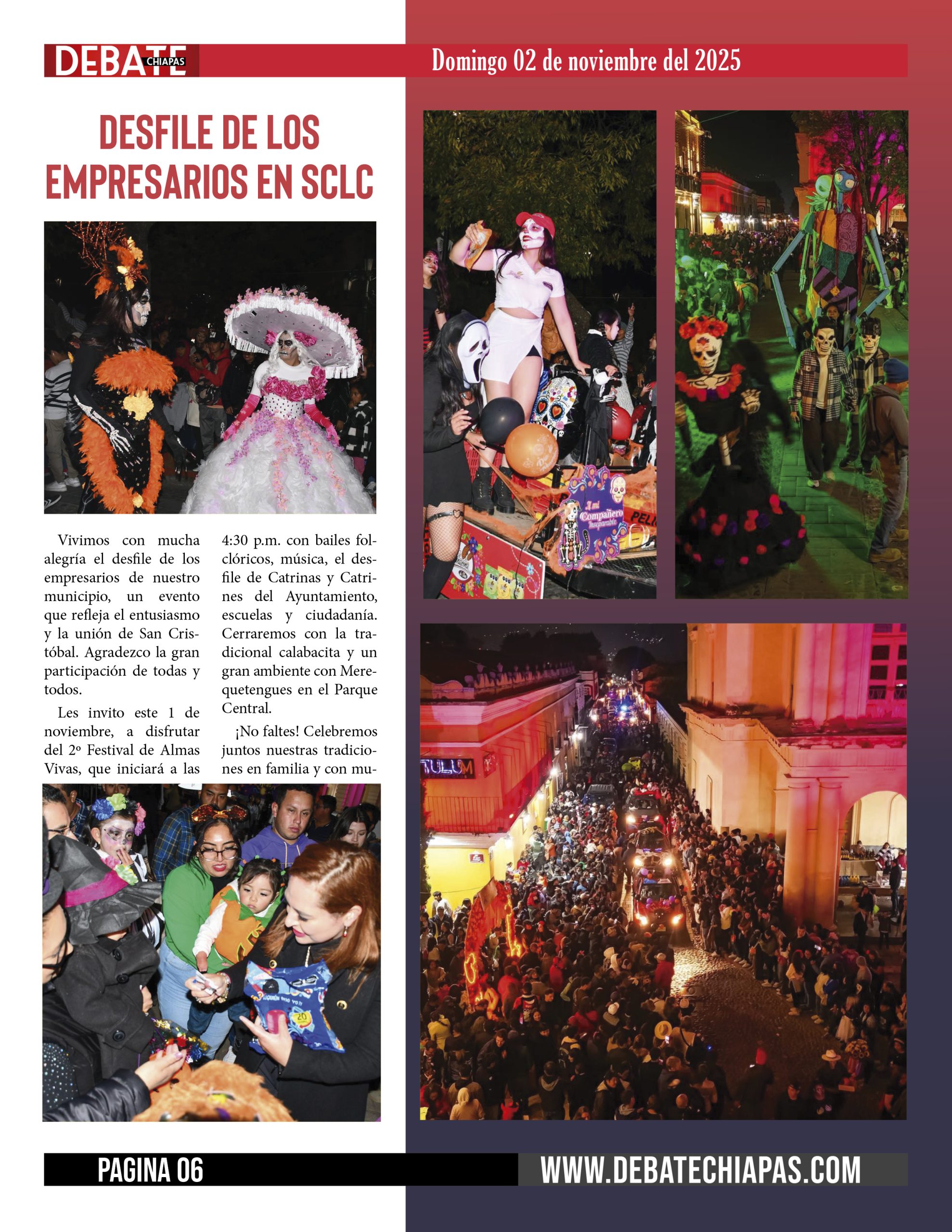 Les invito este 1 de noviembre, a disfrutar del 2º Festival de Almas Vivas, que iniciará a las 4:30 p.m. con bailes folclóricos, música, el desfile de Catrinas y Catrines del Ayuntamiento, escuelas y ciudadanía. Cerraremos con la tradicional calabacita y un gran ambiente con Merequetengues en el Parque Central.